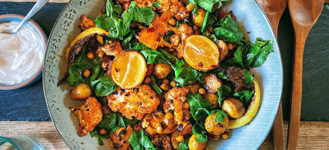 A super-simple one-tray meal that packs a punch. Cauliflower, potatoes, chickpeas and spinach are roasted in a seriously tasty harissa marinade and served with a cooling lemon-scented yogurt. Minimum effort, maximum flavour! I am usually the sort of cook who uses every pan and utensil I can get my hands on, so this one-tray bake … Continue reading Cauliflower, Chickpea, and Harissa Tray-Bake (Vegan, Gluten-free, Grain-free, Soya-free, Nut-free)