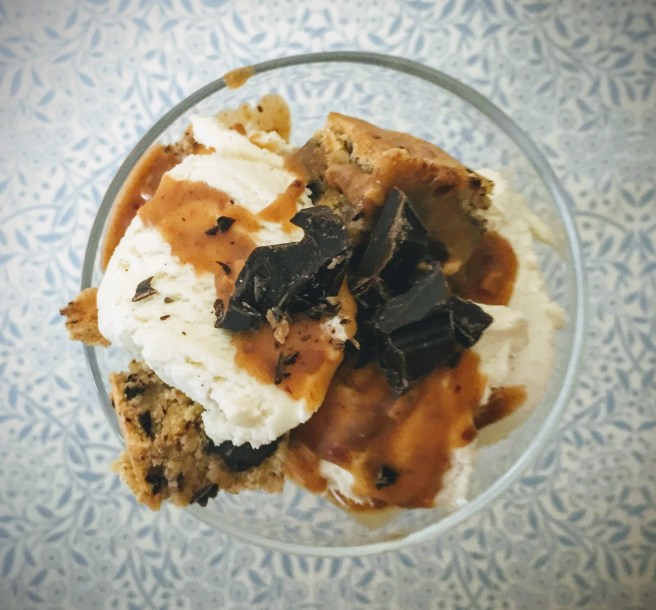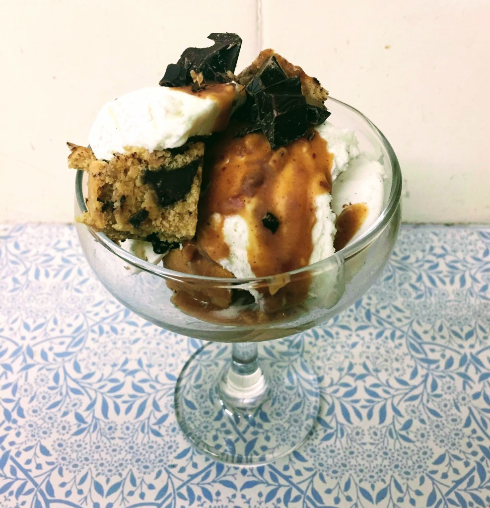 So you may well have seen my earlier store-cupboard blondie post and thought ‘those look delicious, what could possibly be better than that?’. Well prepare to have your MIND BLOWN. I present to you, store-cupboard blondie sundae with a quick peanut caramel sauce.