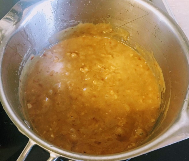 The base goes in the fridge while you make the caramel. This is a really easy not-really-caramel caramel, and part of the reason I like using it here is because it has a much smaller proportion of sugar than standard caramel, while still tasting sinfully sweet (the health benefits of this are secondary to the fact that it means I can eat more of it without feeling like I need a diabetes test). First, melt coconut oil and maple syrup and bring to the boil over a medium heat. Cook for a few minutes until it starts to smell a little toasty then stir in a big wodge of peanut butter. Whisk until smooth, and cook for another minute or two, then remove from the heat to cool and add a little salt (how much will depend on how salty your peanut butter is).