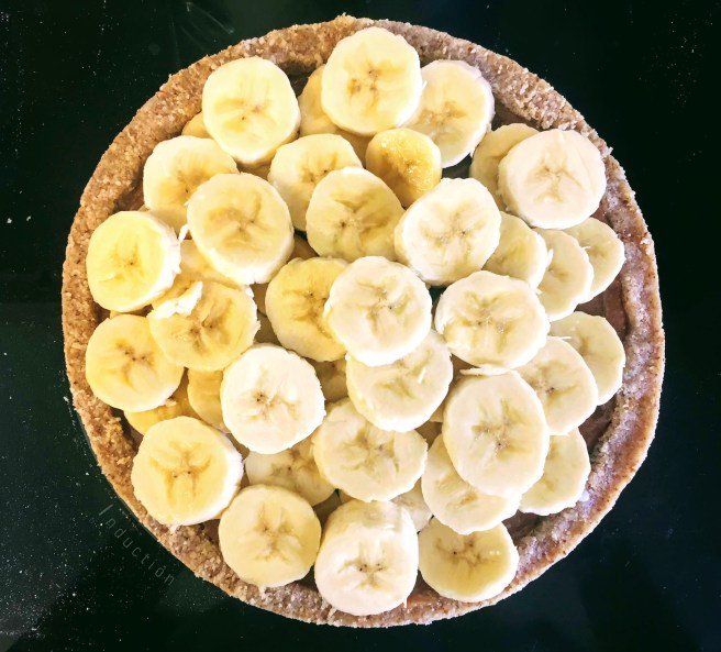 Once the caramel has cooled completely, spread it over the base and put back in the fridge to cool further, for about an hour. Then remove from the cake tin before you add the bananas and cream – the base should be relatively sturdy and hold its shape, provided the caramel was sufficiently cooled, but I would still recommend being careful when removing it from the tin. Slice the bananas and arrange evenly on top (they don’t have to look neat as they’ll be smothered in cream).