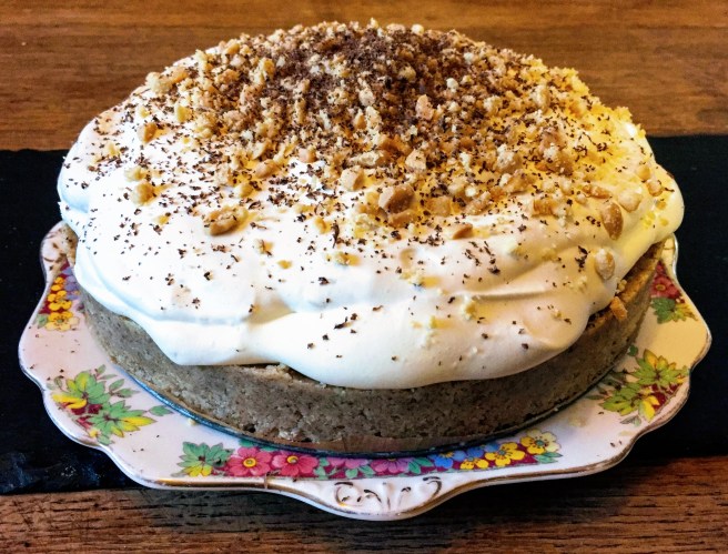 - Slice 3 bananas into coins about 0.5cm thick. Carefully remove the base from the cake tin (the caramel should be firm enough to do this) and arrange the bananas evenly on top. Pile on the whipped cream and sprinkle with a few tablespoons of crushed peanuts and some grated dark chocolate. You can eat straight away or put back in the fridge until you’re ready for it. It will keep in the fridge for a couple of days (if it lasts that long).