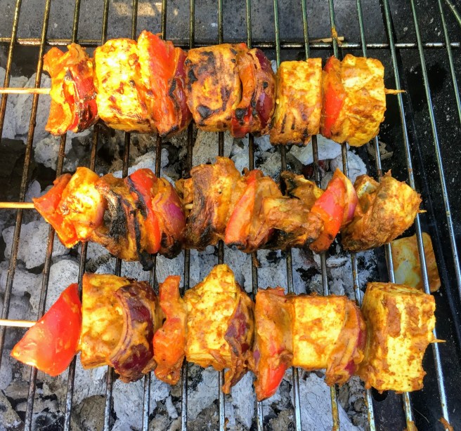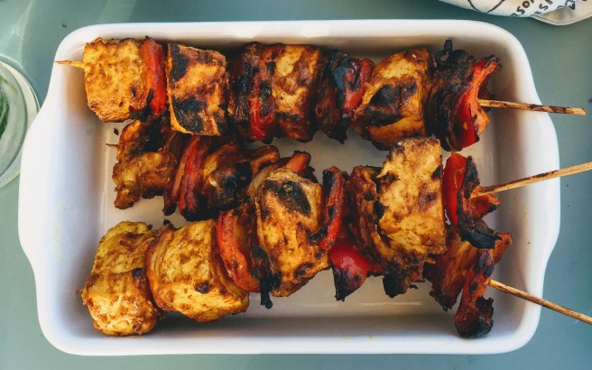 BBQ skewers with tofu, peppers and onion, slathered in a vibrant and spicy tandoori marinade, and charred to perfection