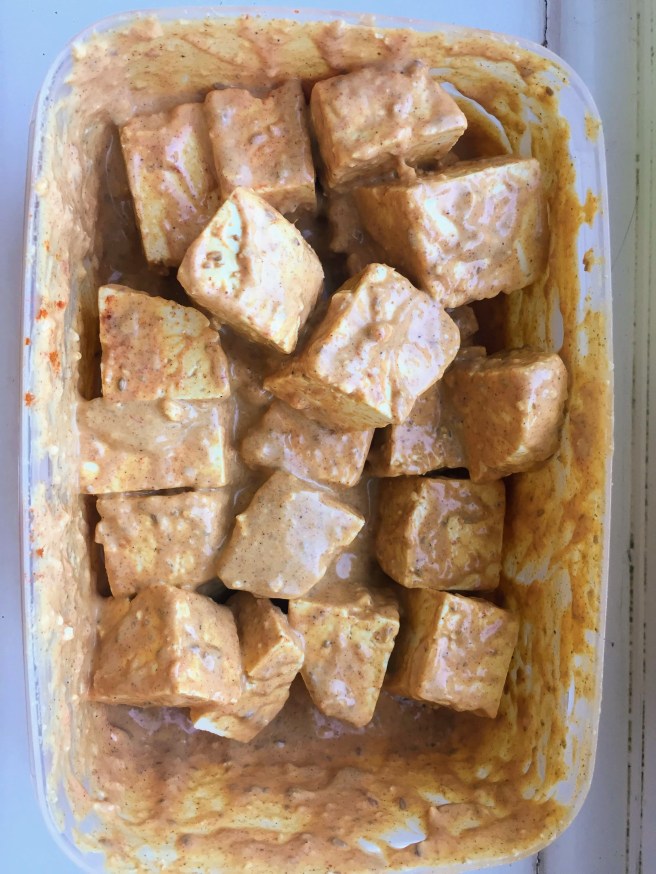 Traditional tandoori marinades are yogurt based, and often contain an extensive list of spices. Vegan yogurt works really well – ideally a thicker one such as alpro greek-style or Coyo, as this will help the marinade cling to your tofu and vegetables. I’ve pared back the spices a little and included a few optional extras, so you still get the flavour without needing to drastically extend your spice rack. The only others additions are some lemon juice for a bit of sharpness, some oil and seasoning. I also like to add a tiny bit of sugar – traditional tandoori marinades would coat meat or paneer, both of which have a little sweetness, so I think it boosts the overall flavour when using tofu.