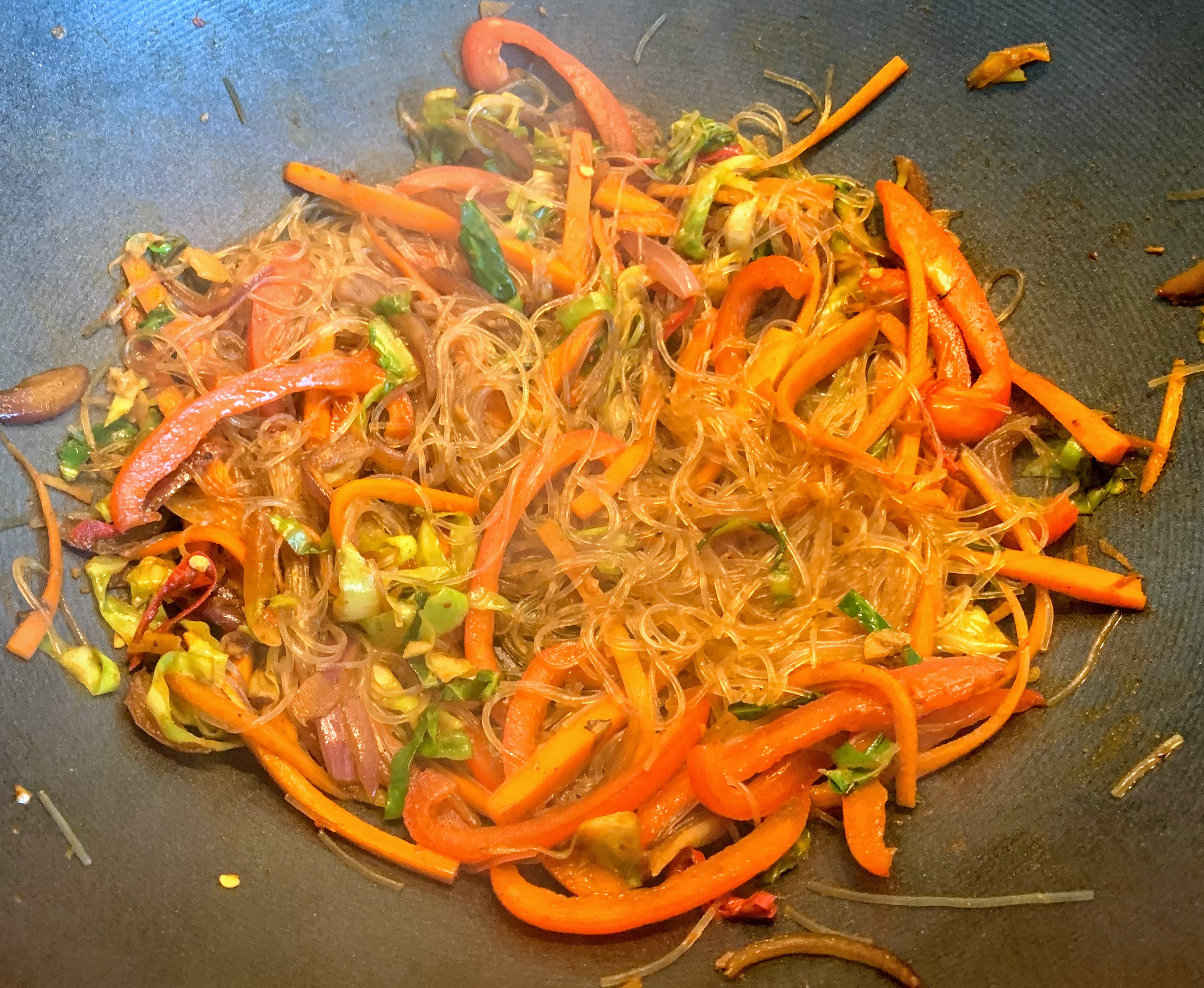 Most singapore noodle recipes have a various sauce ingredients, but when I have been short of time, energy, patience and things in the cupboard, you really only need two for a truly tasty noodly treat; tamari (or soy sauce) and curry powder. You can use a mild, medium or hot curry powder depending on your preference (you can always adjust the amount of fresh chilli or leave it out entirely). These are added after you’ve stir fried your vegetables, and are followed by the cooked noodles. Then stir until everything is coated and warmed through.