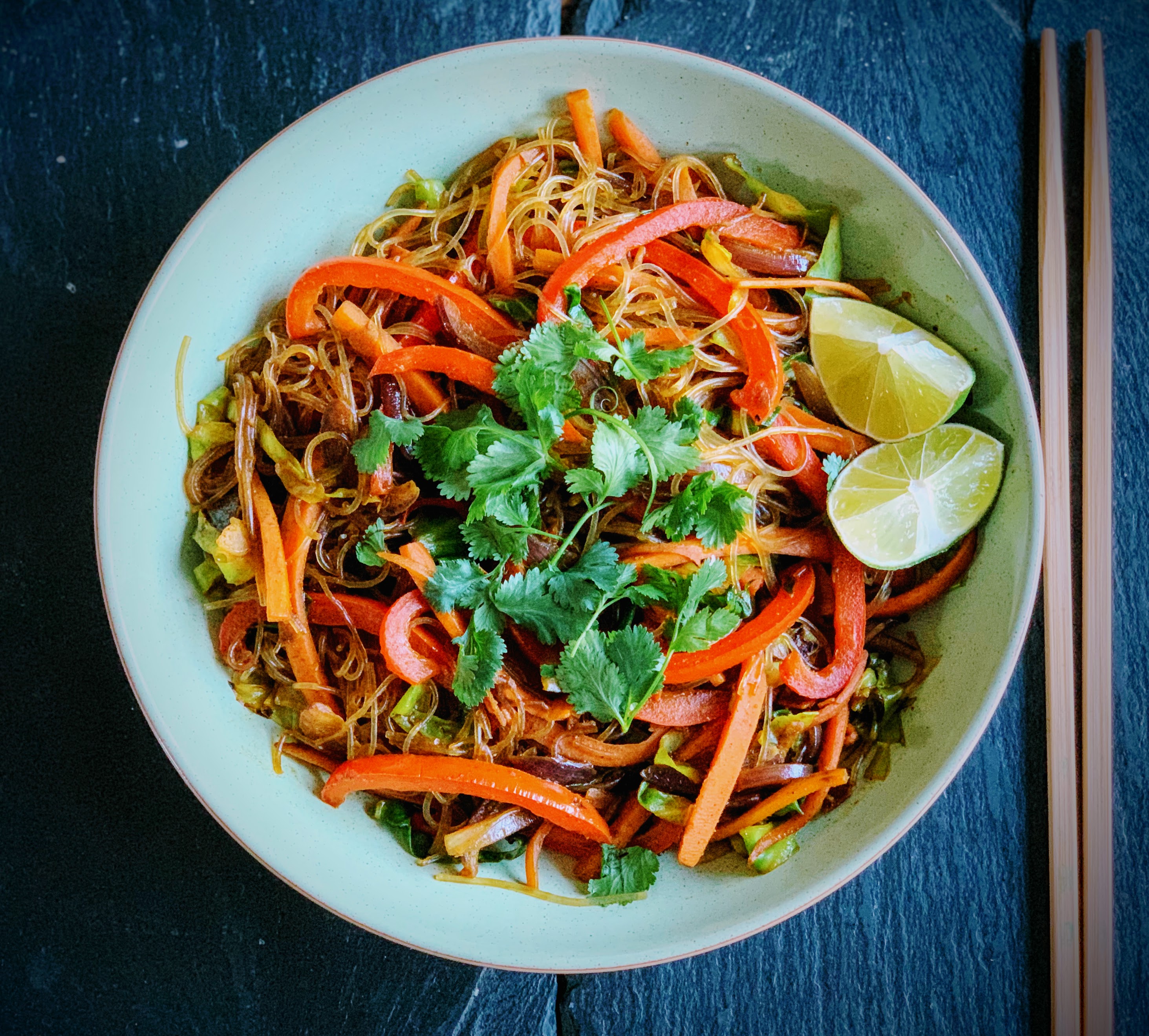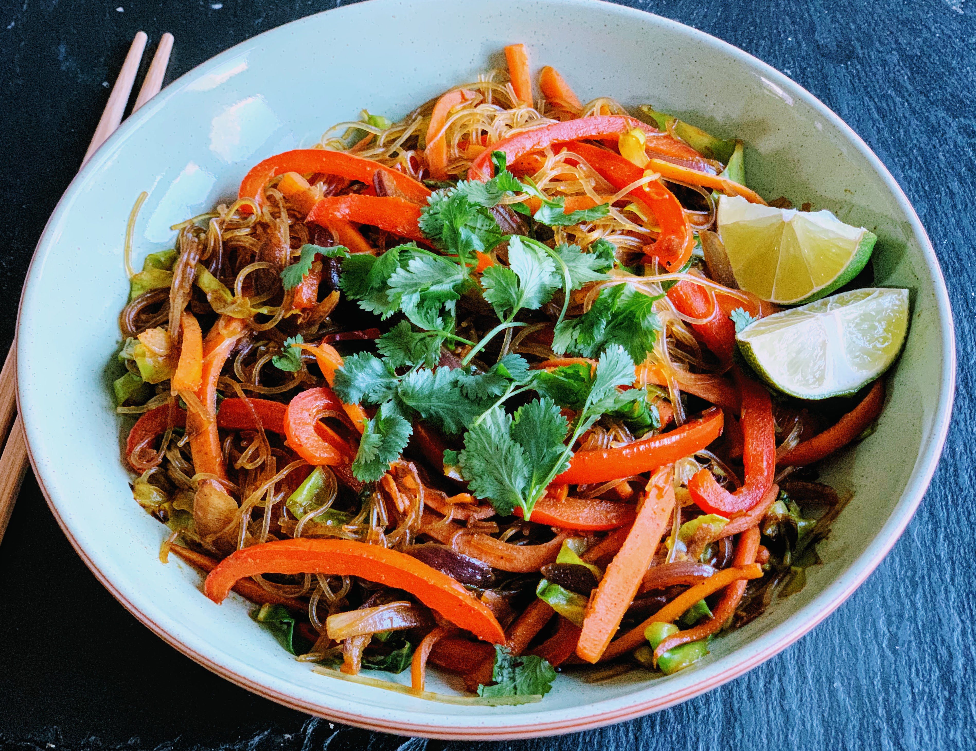4. Return the wok to the hob and turn the heat up to medium-high. Add 2 tbsp oil and the sliced onions and stir fry for 1 minute before adding the garlic, ginger and chilli (if using). Stir fry for 30 seconds then add the carrots, peppers, and any additional vegetables. Cook for 2 mins, stirring frequently, before adding the beansprouts. Stir fry for 3–4 minutes until the beansprouts have softened, then add 2 tsp curry powder and 3 tbsp tamari. Stir until all the vegetables are coated, then tip in the drained noodles and stir fry for another minute, ensuring the noodles are coated and hot through. Serve immediately with a sprinkle of coriander and a lime wedge.