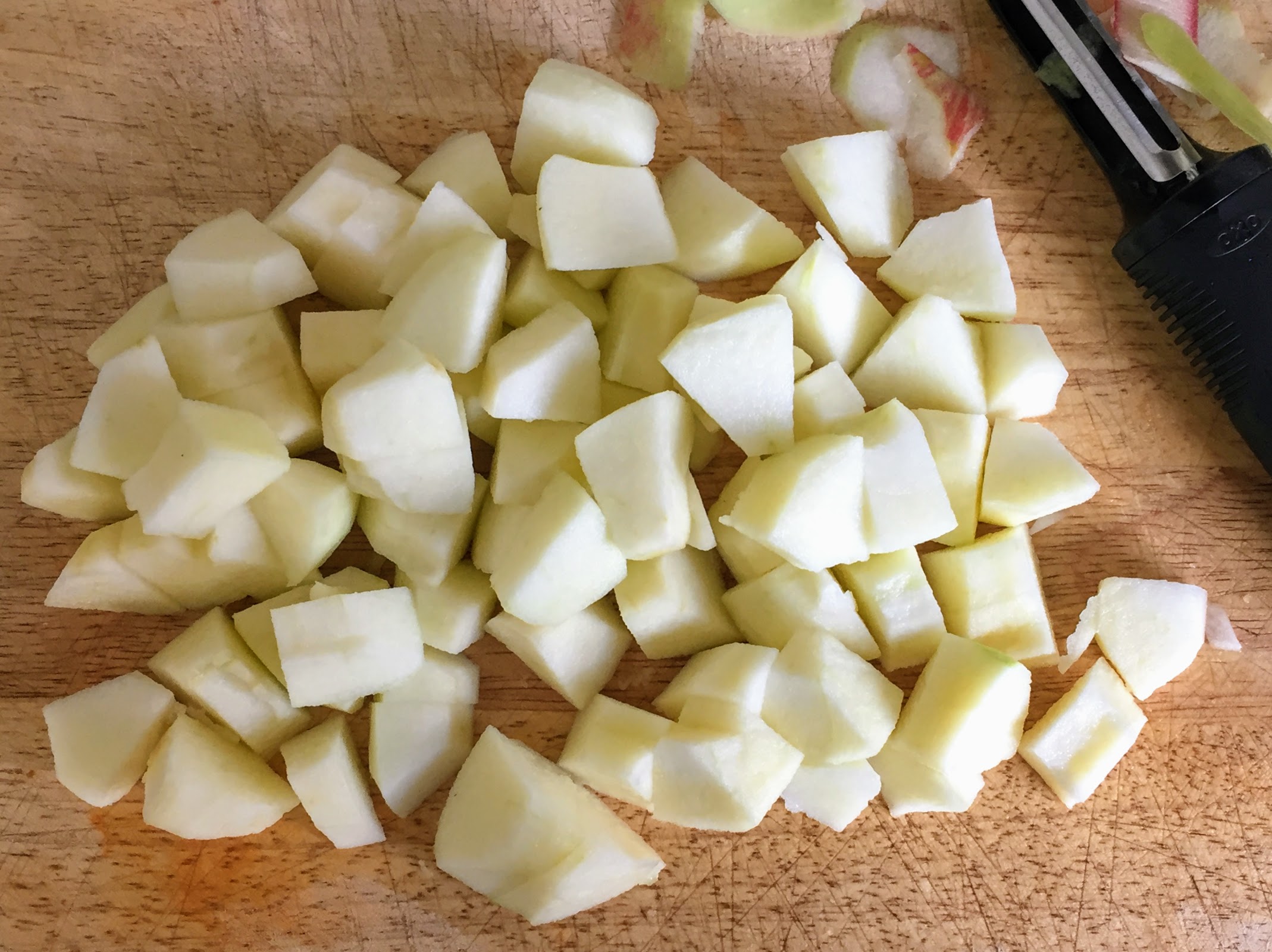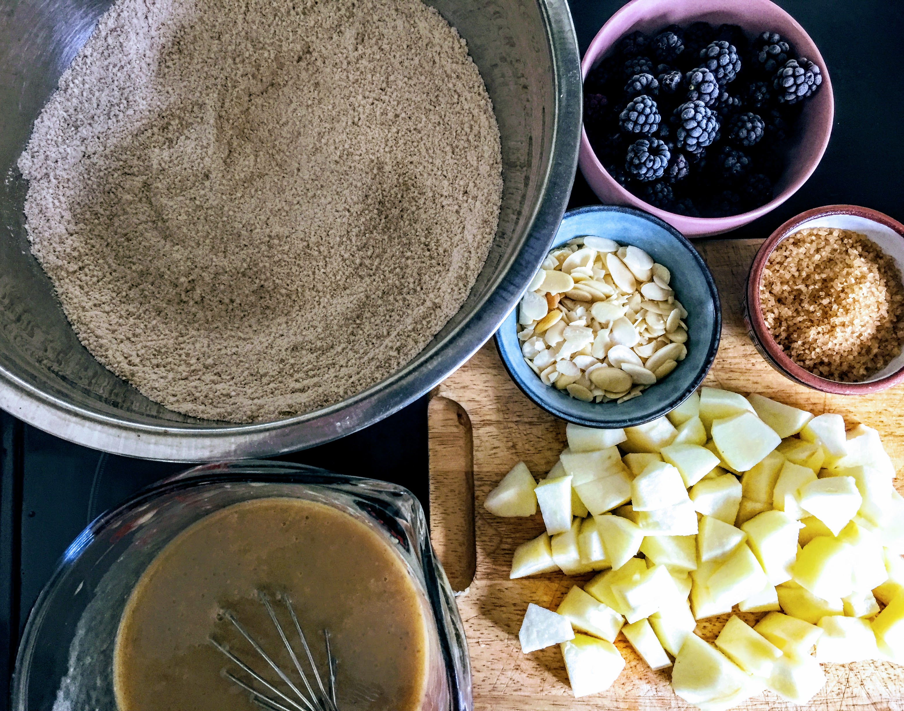 - Peel and core 2 eating apples and chop into roughly 2 cm dice. Weigh out the blackberries, and in separate bowls, weigh out the topping ingredients: 50g demerara sugar and 35g flaked almonds (if using).