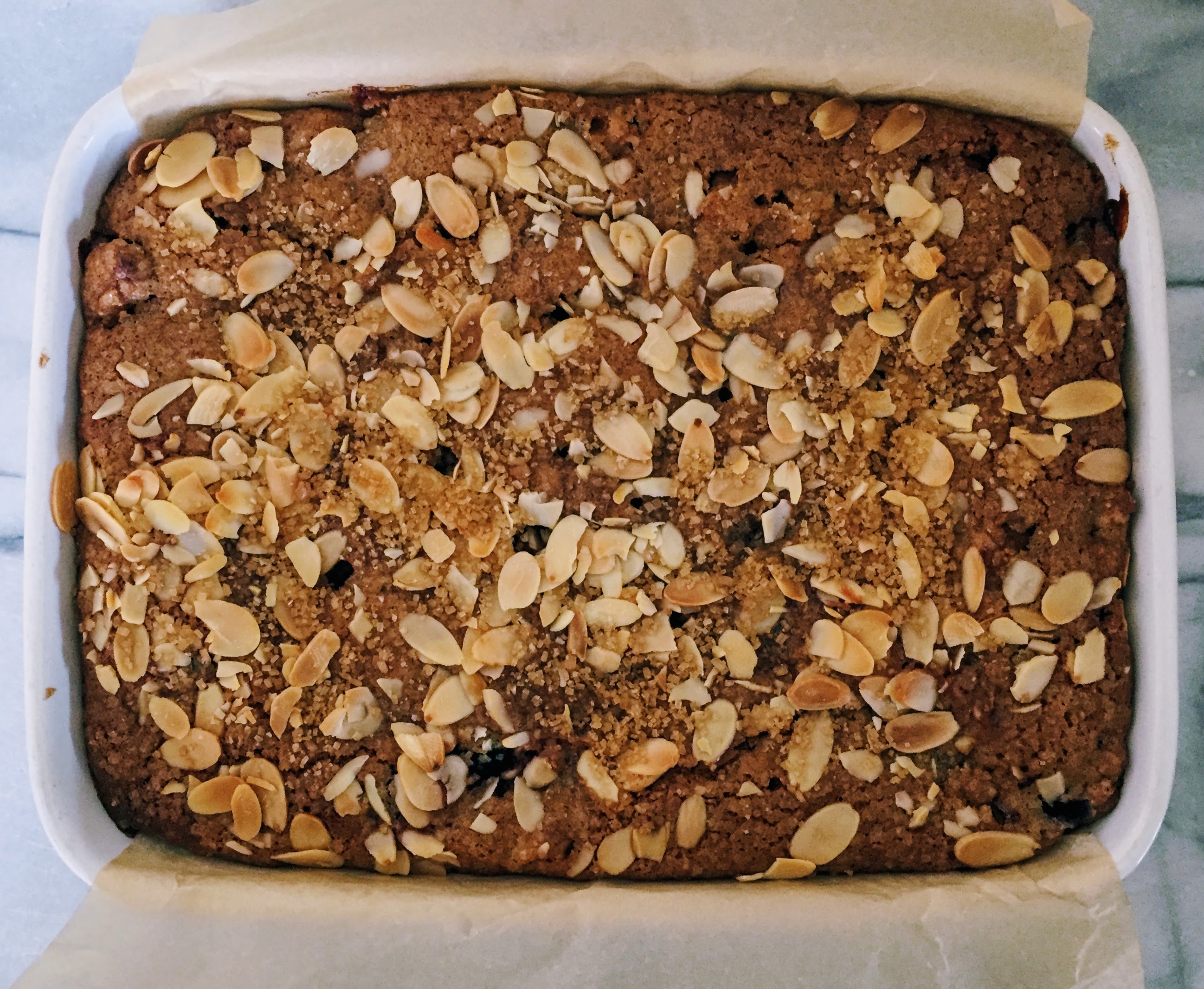 Essentially this is my ideal apple cake. It is incredibly moist, with pockets of fruit from blackberries and chunks of apple that have almost melted into the surrounding sponge. It’s lightly spiced, with caramel-undertones from the use of brown sugar, and a crunchy caramelised crust due to a liberal topping of demerara sugar and flaked almonds. It’s also gluten-free, meaning everyone in my family can eat it, and would be perfect for an afternoon treat by itself, or with generous quantities of vegan vanilla ice-cream, custard or cream for a sumptuously comforting pud.
