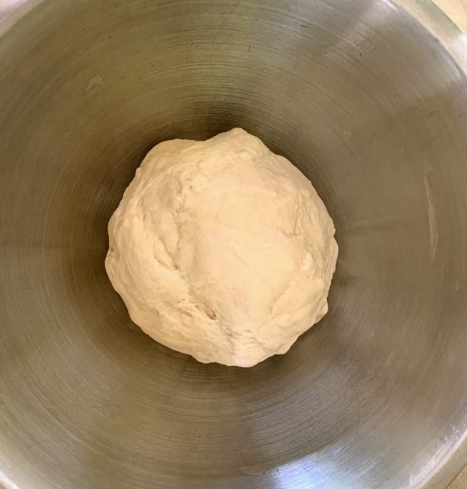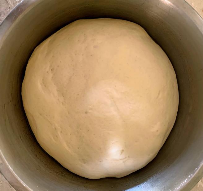 - Add the rest of the dry ingredients (400g flour, 1 tsp baking powder and 1/2tsp salt) to the bowl with the remaining sugar. Once the yeast mixture is frothy on top, add to the dry ingredients and mix with your hands until it forms a shaggy dough. Transfer to a lightly floured surface and knead for 5–6 minutes until smooth and elastic. Clean and lightly oil the bowl, and return the dough to it, covering with a damp cloth or tea towel, and leave to prove for around 90 minutes until doubled in size (it may take less time on hot days or longer on cold).