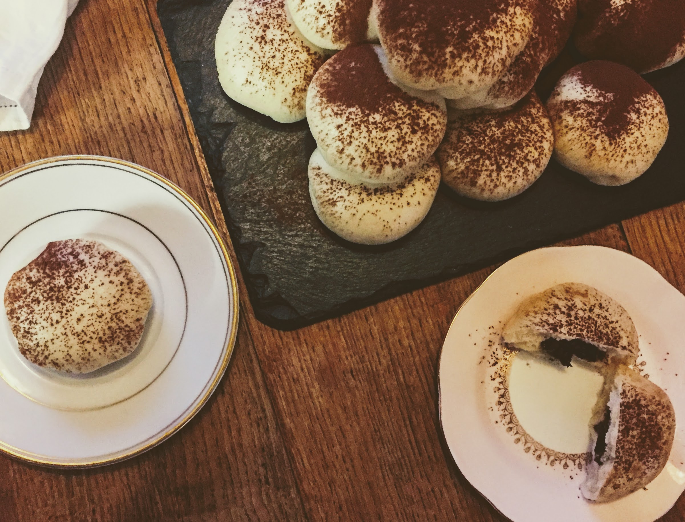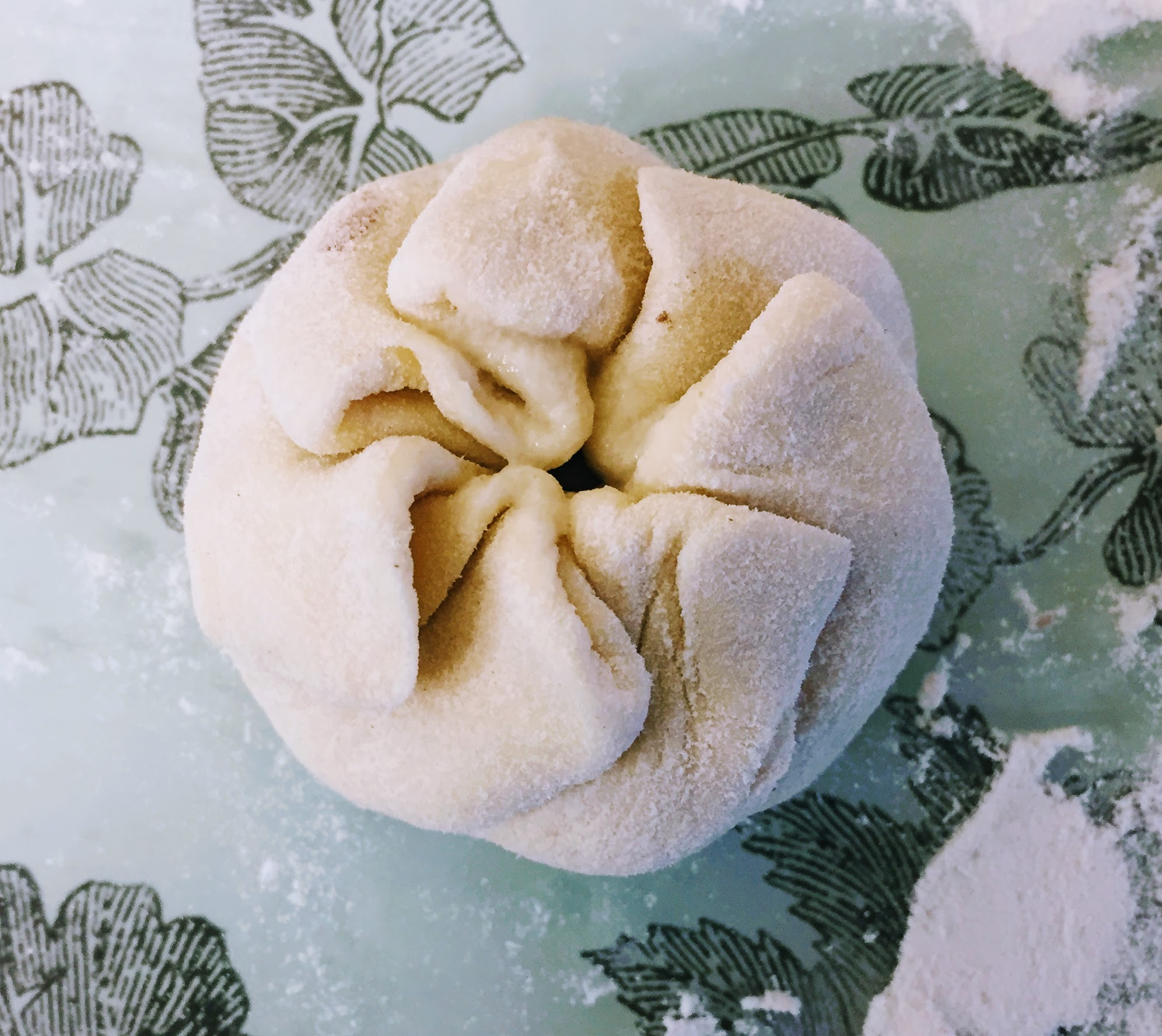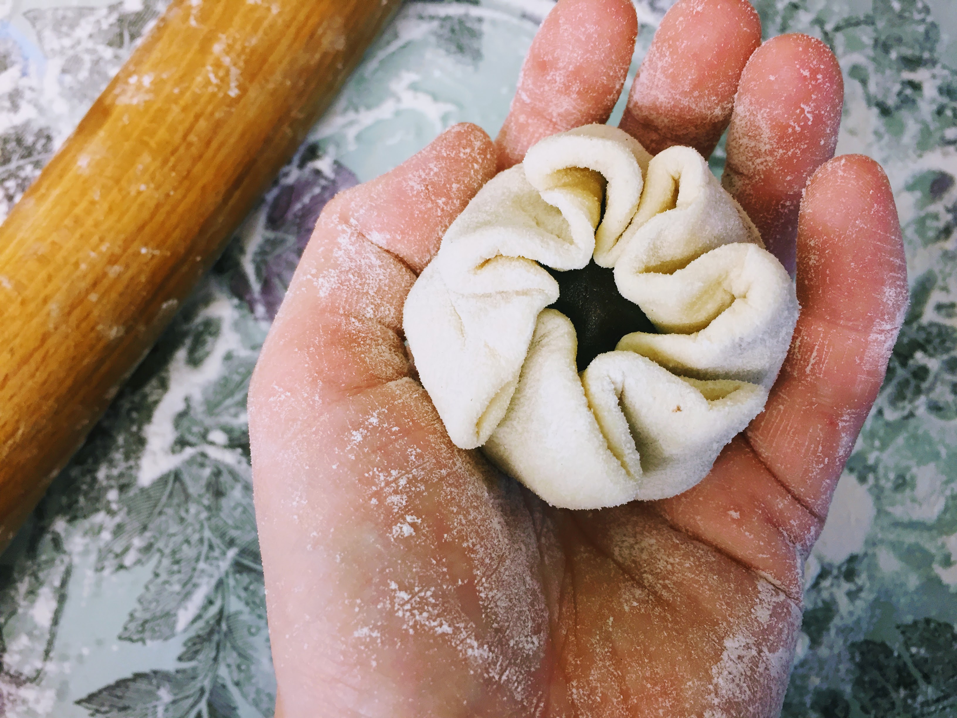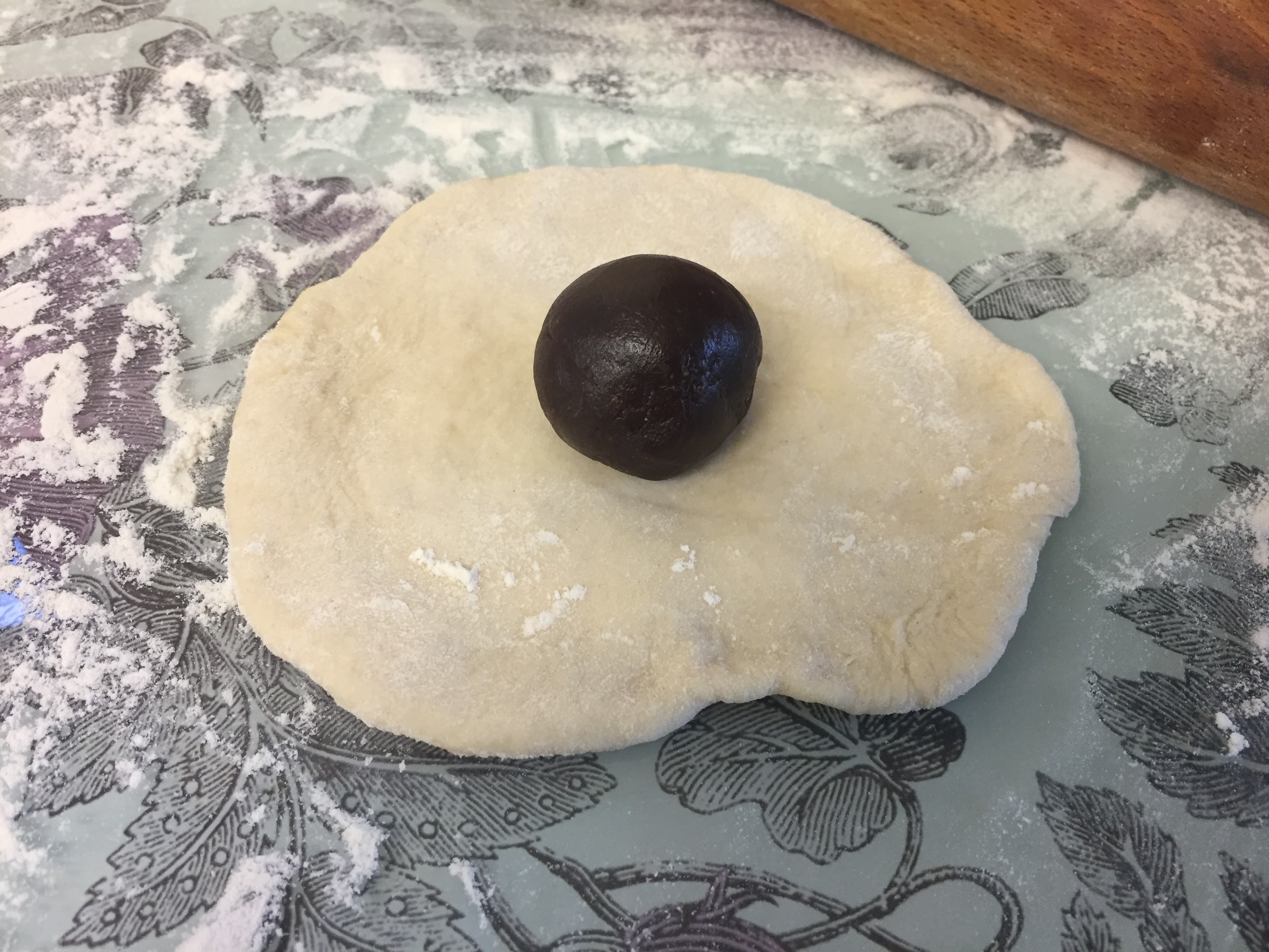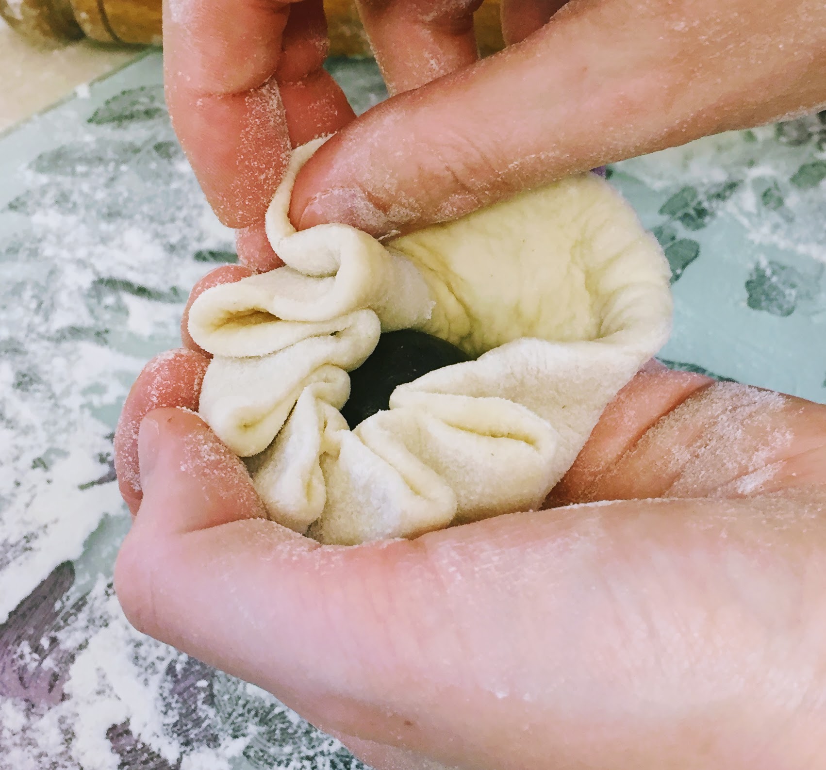- Take your small piece of dough, roll it into a ball between your palms and flatten slightly with the heel of your hand. Roll into a small circle with the rolling pin (roll the centre of the dough, leaving the top and bottom a little thicker, then turn 45 degrees and do the same, and repeat until you have a circle). Then go around the edge of the circle with the rolling pin, rolling out the edges and leaving a thicker disc in the middle; a bit like a fried egg. Scoop a level tablespoon of ganache and place in the middle of the dough (you may need to clean your hands with the damp cloth at this point, so you don’t get ganache on the outside of the bun), then lift the entire thing into the palm of one hand, and pleat the edges around the ganache with the other (see photos in the blog post above).