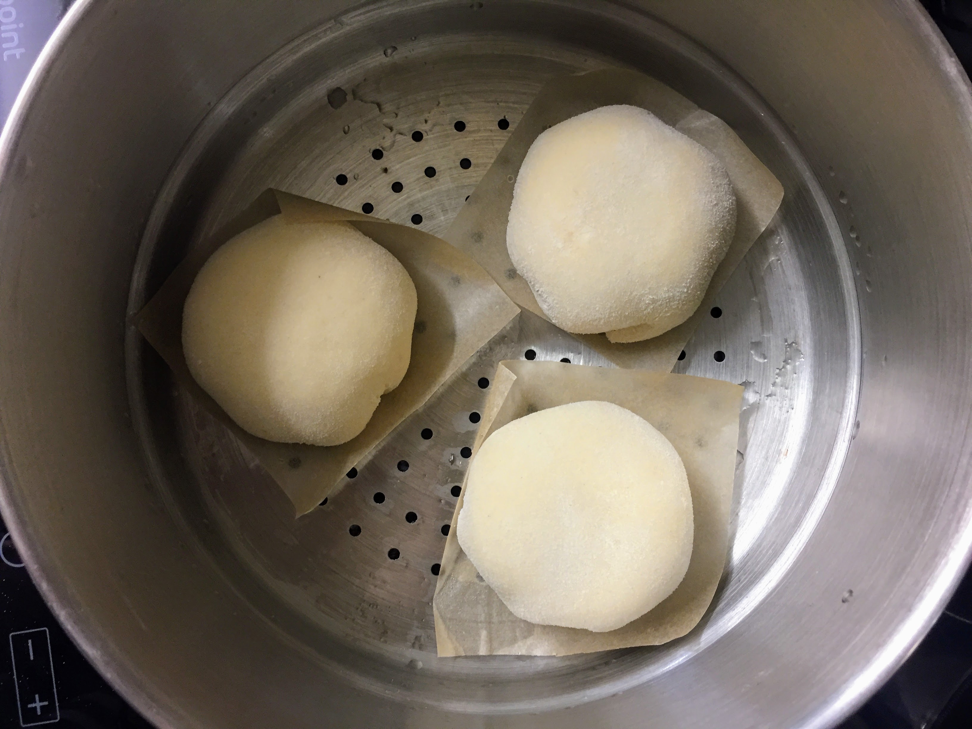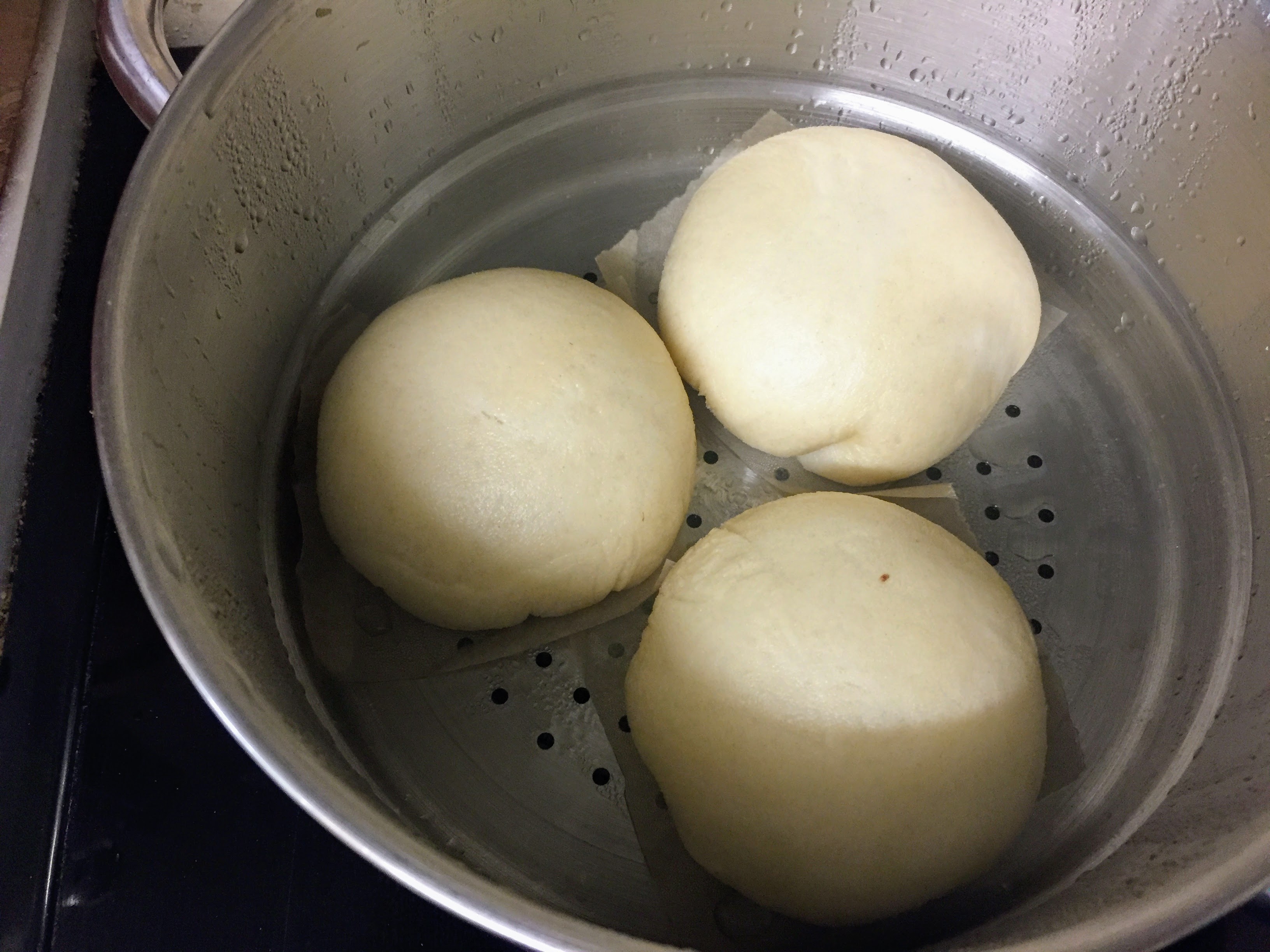 The shaped buns need to be left for another 30 minutes so they get a little more puffy before they are steamed. As the shaping and pleating is a little time consuming, I time them from when then first six are shaped (six being the number I can fit in my steamer at any one time). I use a three tier metal steamer, as this is what I have already, but the bamboo ones are also brilliant and and inexpensive. After 30 minutes, get the water in the bottom of your steamer to boiling point, reduce to a medium heat and then steam the first batch, still on their baking paper squares, for 8 minutes. You’ll know they’re done if you poke them gently and they spring back immediately.