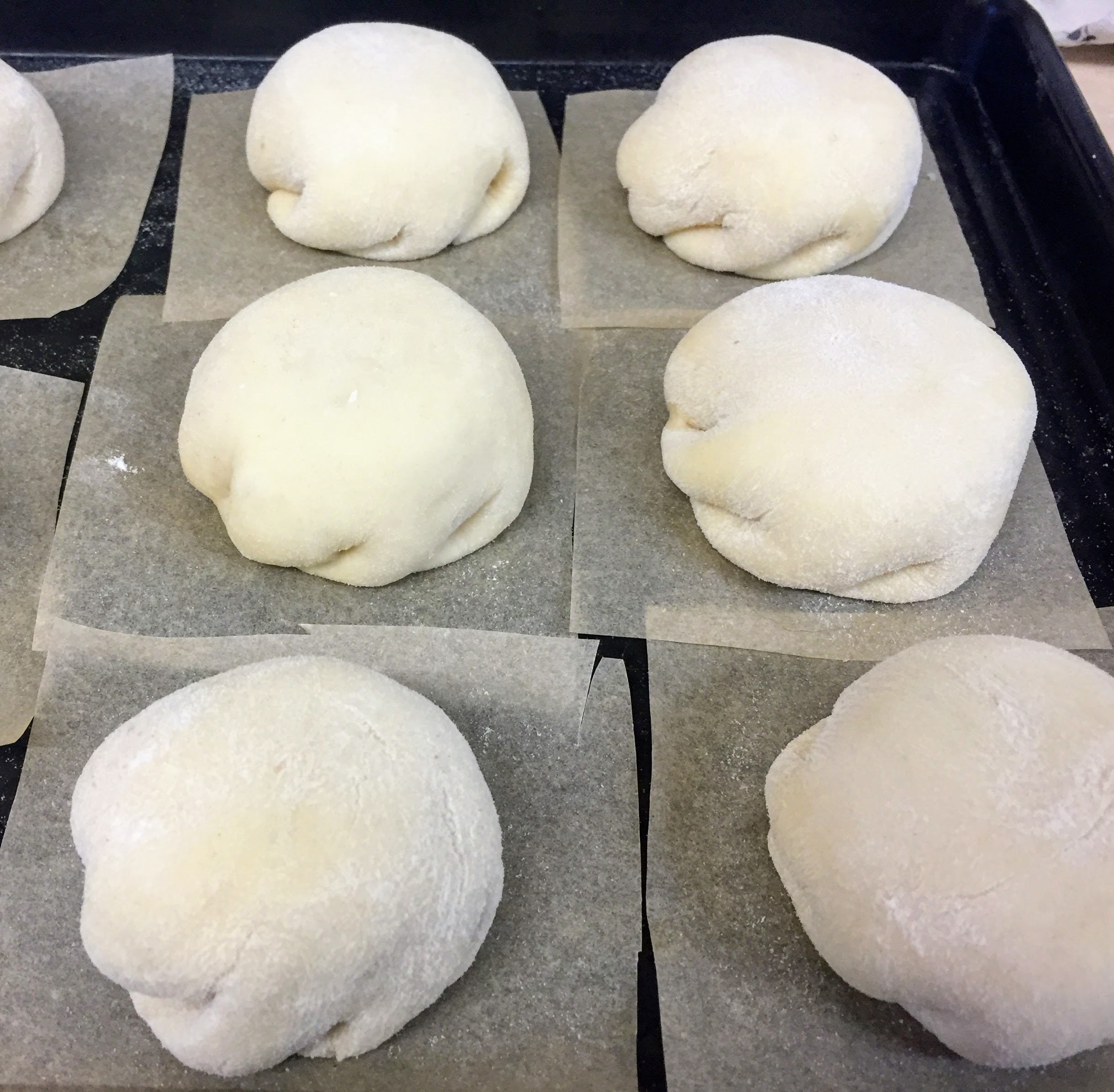 - Twist the pleats slightly to bring them together around the ganache. Dab a tiny bit of water on the edges of the pleats to bring them together in the centre (don’t worry if there’s still a small hole) and place the bun pleat-side down on a square of baking paper, on a baking tray. Cover with the clean dry tea towel, and repeat with the remaining dough.