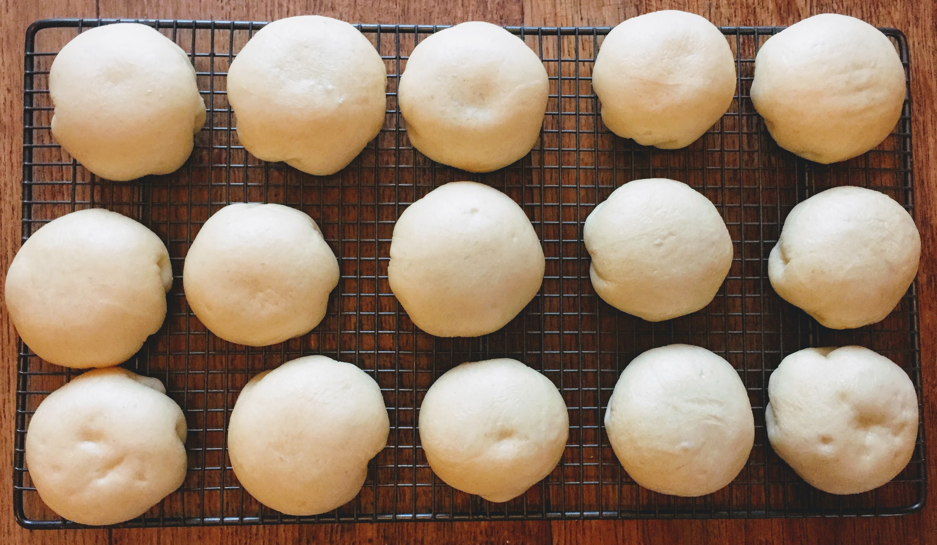 - Leave the shaped buns for 30 minutes to get puffy (I time this from when the first six are ready as this is how many I can fit in my steamer at one time). Put your steamer on a high heat and bring to the boil, then reduce to a medium heat and add your first batch of buns, still on their baking paper squares. Steam for 8 minutes, until they spring back immediately from a gentle poke. Transfer to a wire cooling rack, removing the buns from the baking paper squares but keeping these to one side, and repeat with the remaining buns.