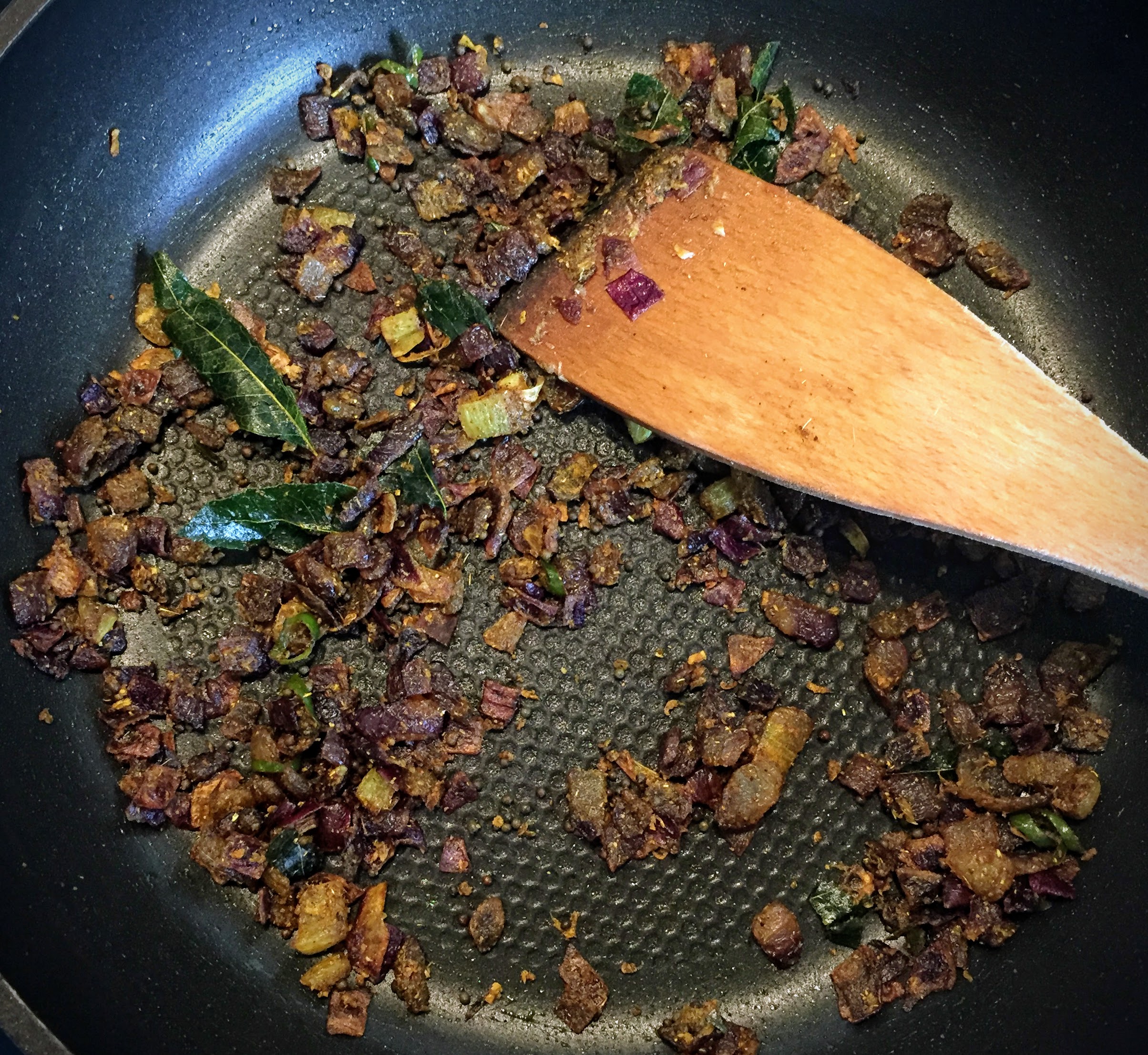 - While the potatoes are cooking, put a non-stick frying pan on a medium heat with 1 tbsp oil. Finely dice a large red onion, and add to the pan with ¾ tsp black mustard seeds and 8 curry leaves. Stir-fry for a couple of minutes then turn the heat down a little and cook for 10-15 minutes, stirring occasionally. You want to onions to get soft and sweet and start to caramelize, so don’t rush this step! Finely chop 1 green finger chilli and grate or crush 3 garlic cloves. Add to onions once they have browned, and stir-fry for 2 minutes, then add ½ tsp turmeric, 1½ tsp garam masala, and ½ tsp salt. Cook for another 2 minutes, then remove from the heat.