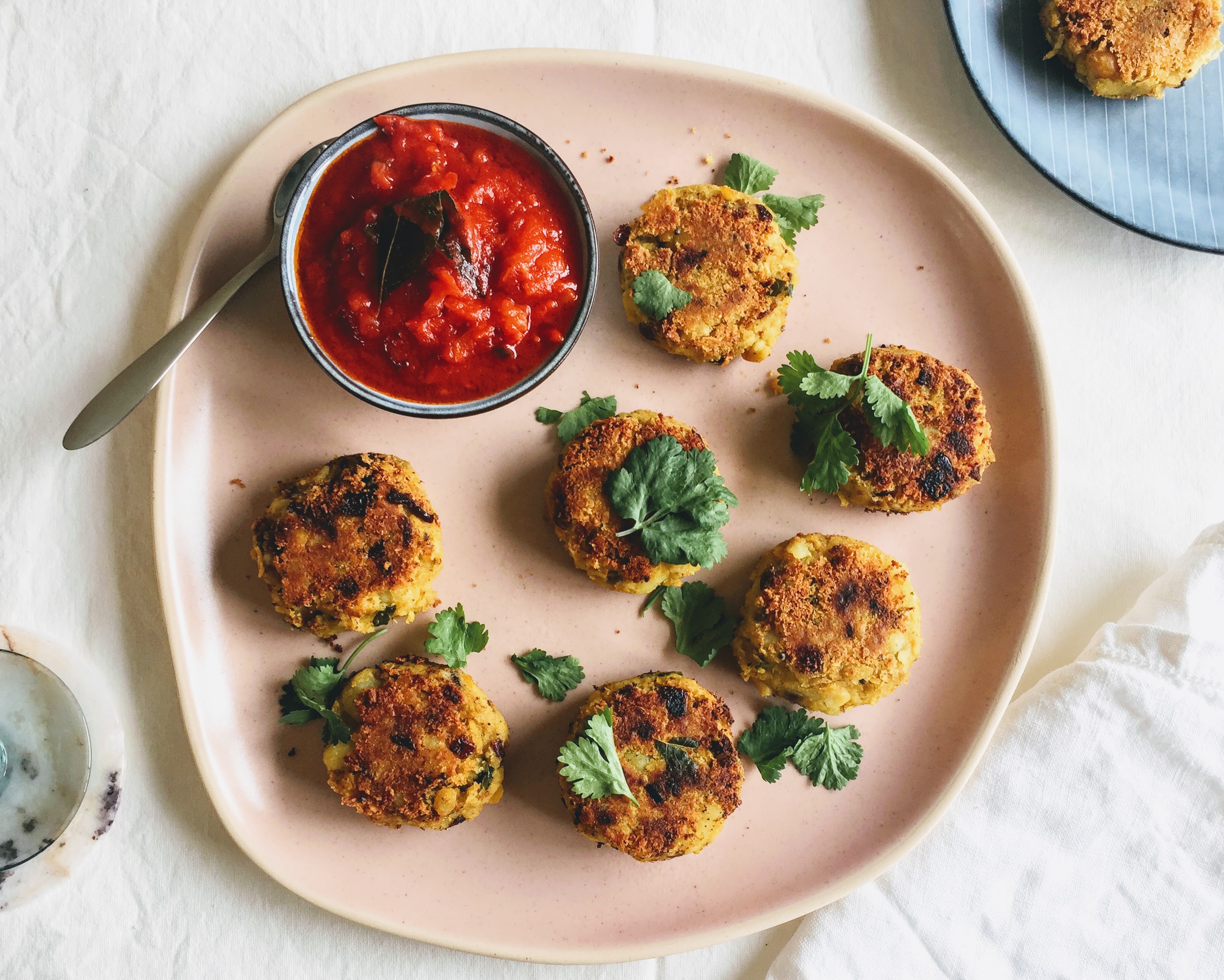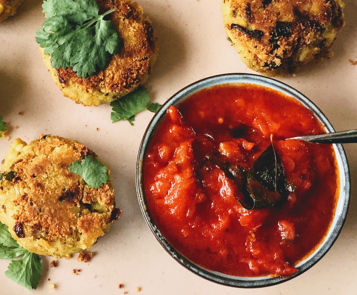 Crispy potato and chickpea patties, spiced with tumeric, mustard seeds, and garam masala, with a side of sweet and tangy tomato chutney, spiked with chilli.