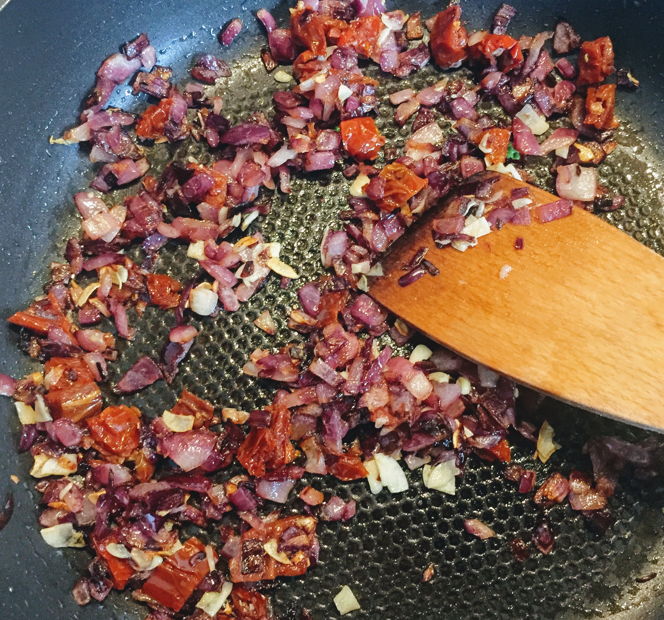 This dish is really straight forward to put together; a few ingredients and a little chopping and frying, and you’re done. Start with a finely diced red onion (you could use white but I’d recommend frying it really low and slow to bring out the sweetness, or shallots would be fine). The reason I specify using sun-dried tomatoes in oil, is that they are essentially ready-to-eat, unlike the dried version, and I use the oil from the jar for frying. This adds an extra boost of flavour that permeates through the scramble.