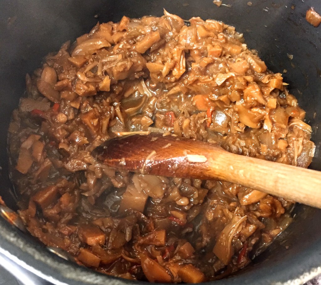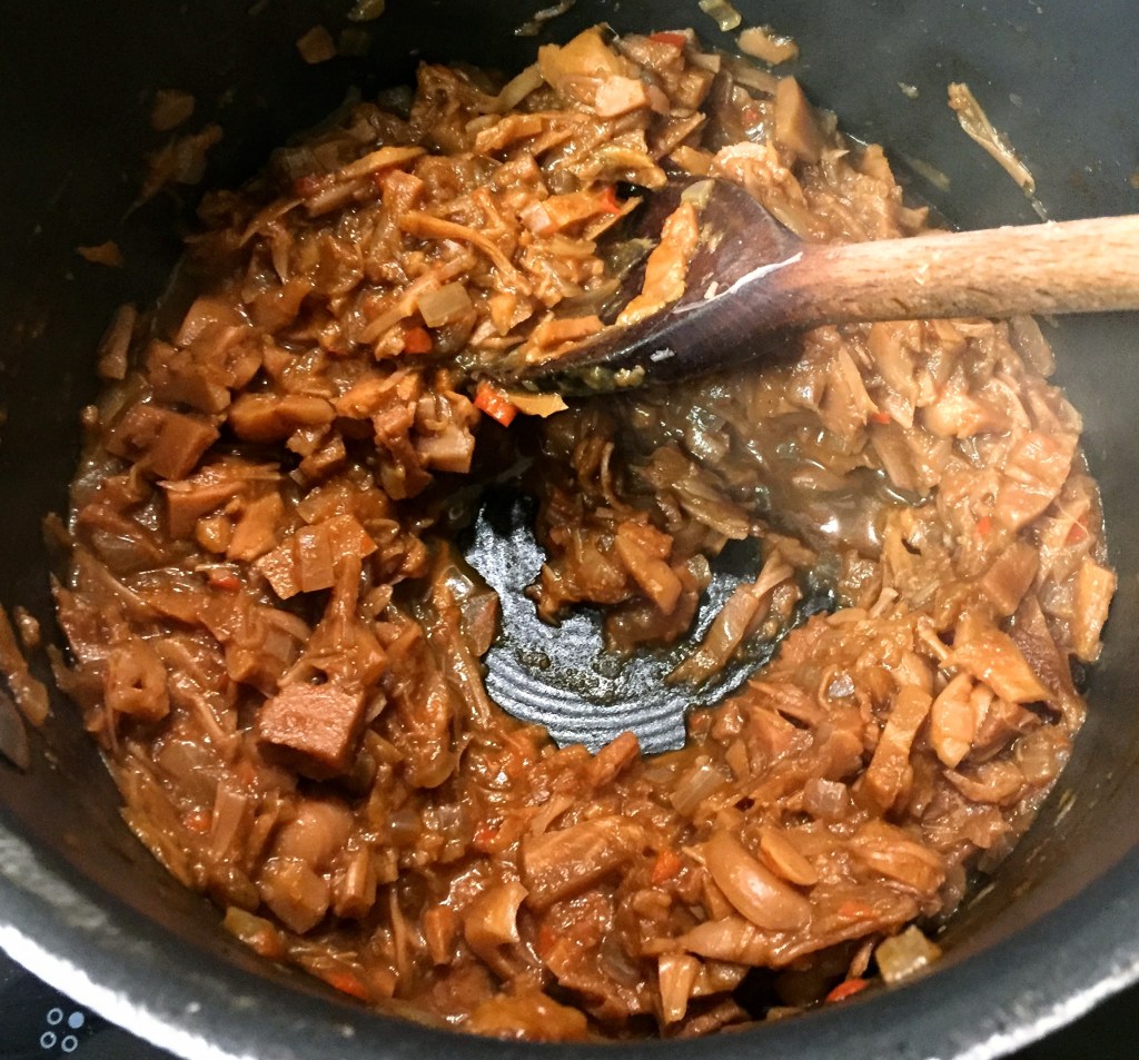 I came up with this recipe as a filling for steamed dumplings, but have since used it liberally for other things because it is SO GOOD. I’d made some attempts at jackfruit before and never been entirely happy with the results – either the texture was a bit off or the depth or balance of flavours wasn’t quite right. The main problem that I had with this version is trying not to eat all of it before I could use it as a filling. Which is not a bad problem to have.