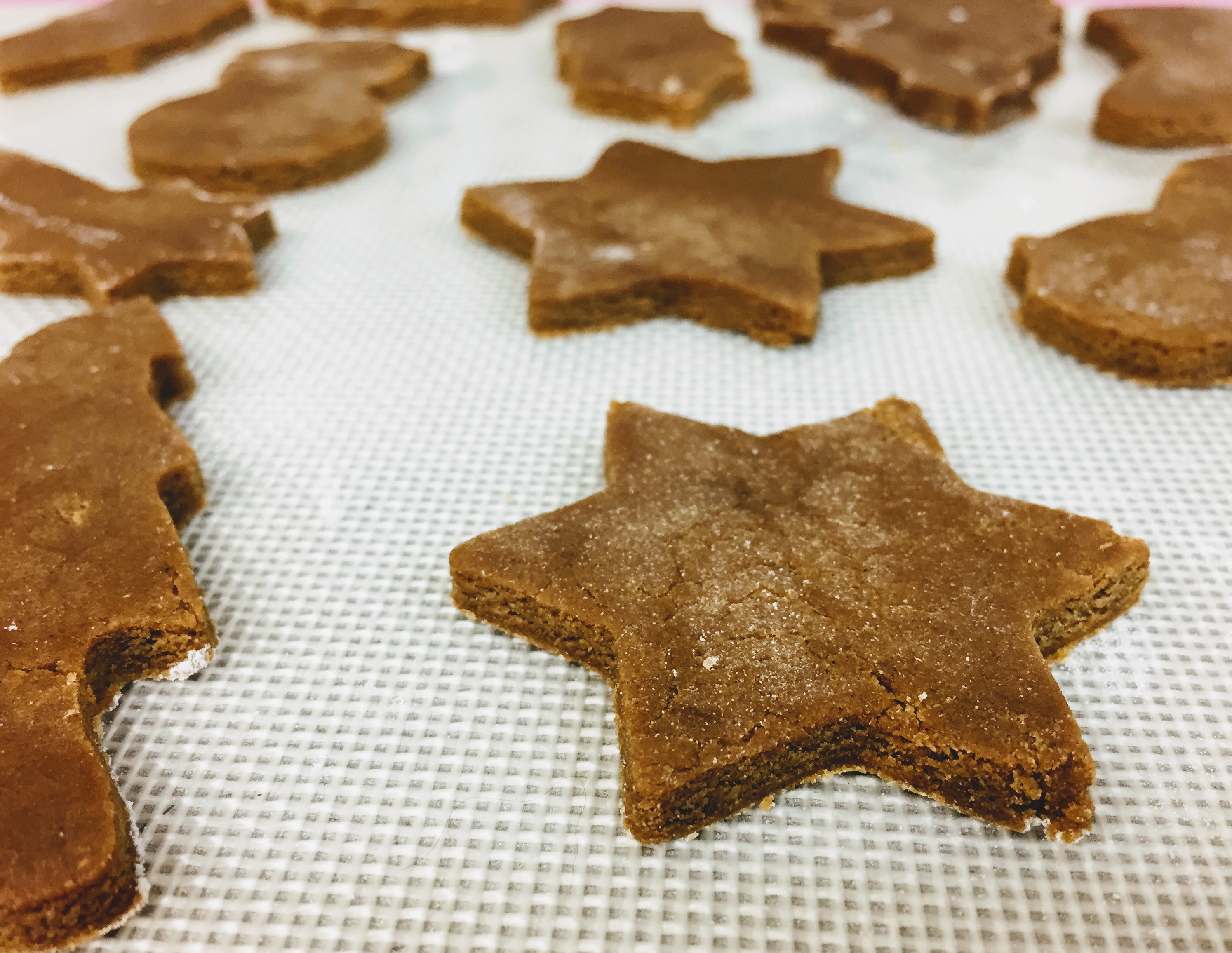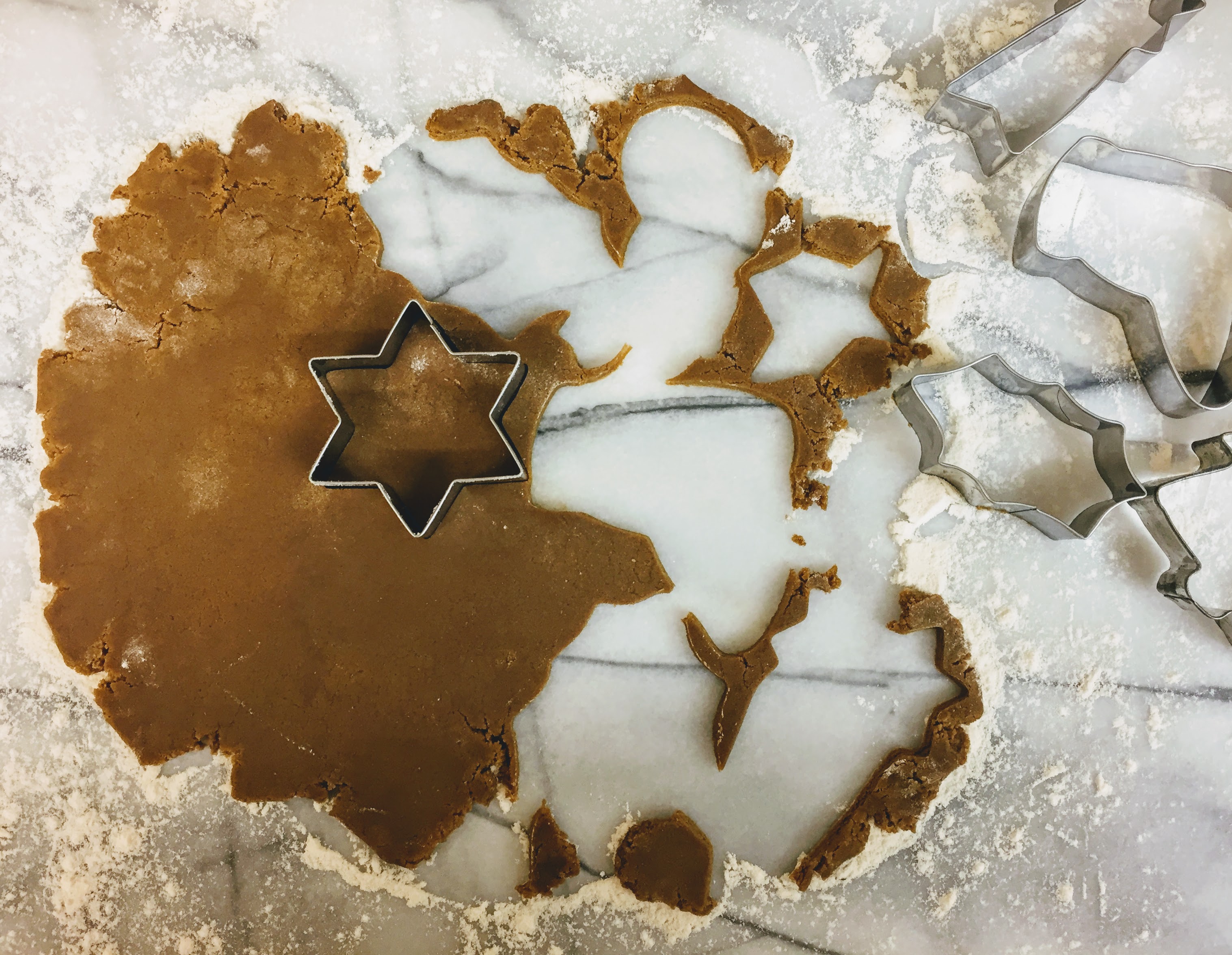 - Pre-heat the oven to 170C fan, lightly flour a work surface and line a baking tray with baking paper. Take your dough out of the fridge and roll out until it is approximately 5mm thick. Using some festive cookie cutters, cut out as many biscuits as you can and place on the baking tray with a little space between each. Bring the remaining dough together and roll out again, and cut out more biscuits, repeat until you have used up all of the dough.