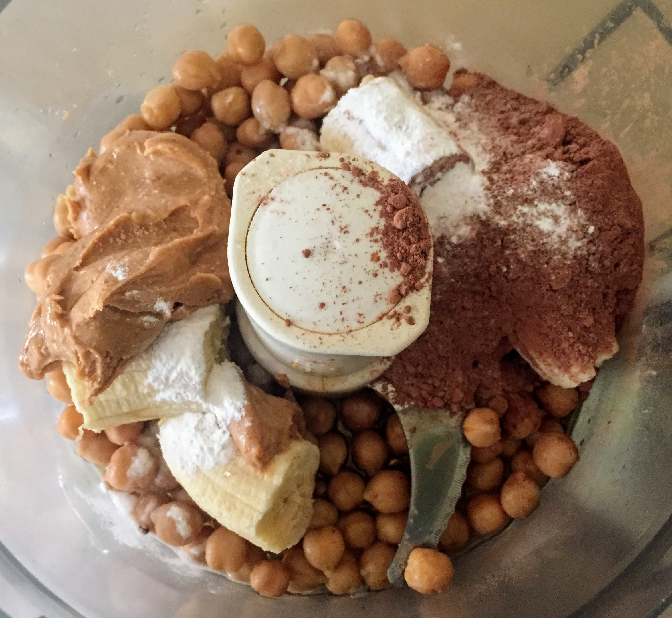- Drain 1 tin chickpeas and add to a food processor along with 1 small banana, 4 tbsp peanut butter, 5 tbsp cacao powder, 4 tbsp maple syrup, ¼ tsp salt and ½ tsp baking powder. Blitz until completely smooth (you may need to scrape down the sides a couple of times), then taste and add a little more maple syrup or salt if necessary. Stir in 50g chocolate chips or chopped nuts, if using.