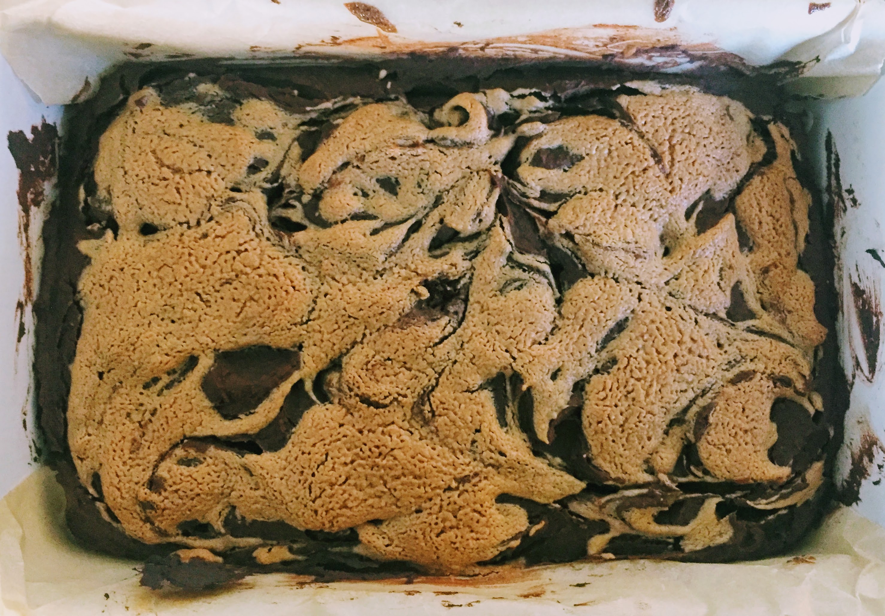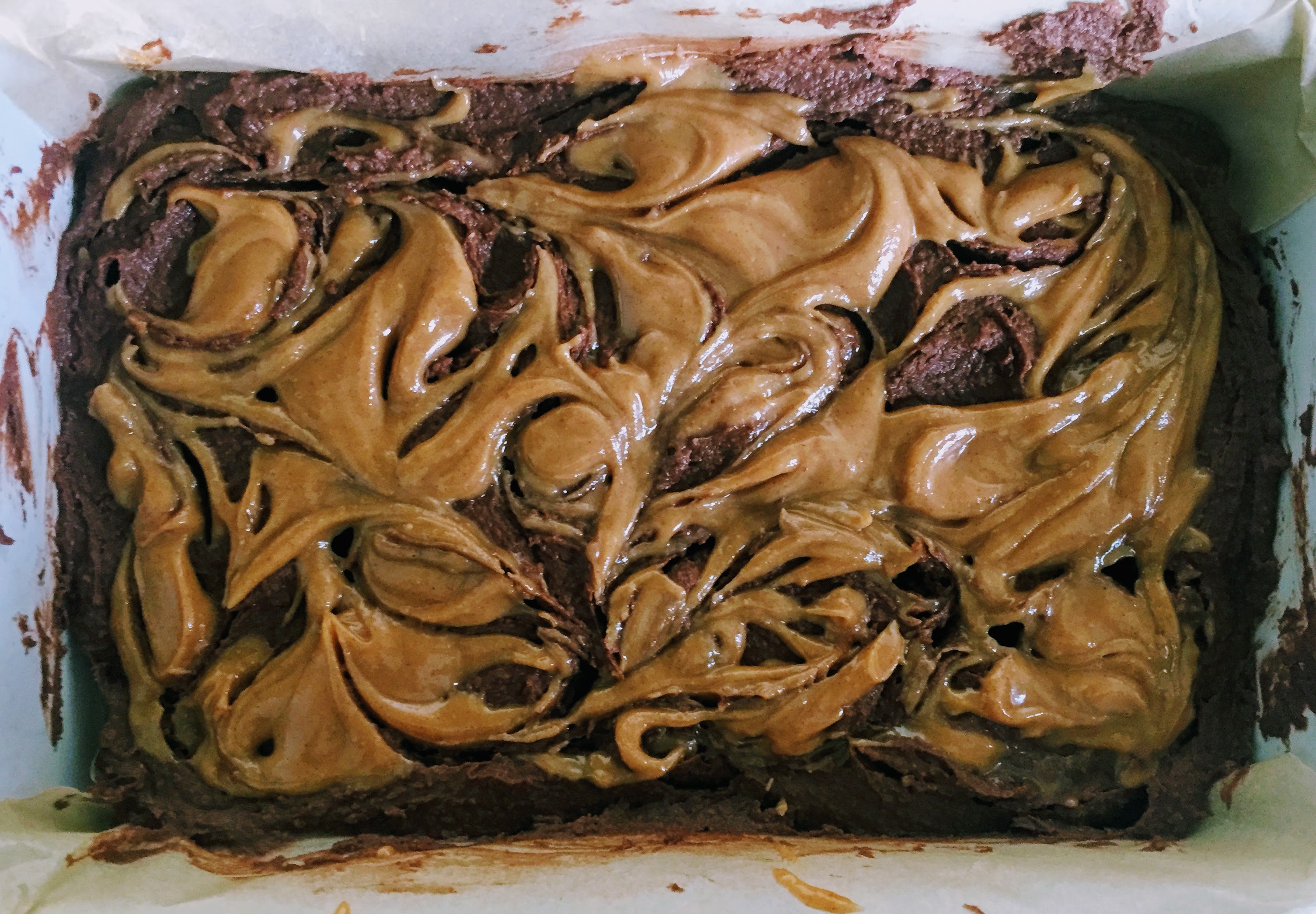 For the peanut butter topping, put a little more peanut butter, a long with some maple syrup, coconut oil and a pinch of salt in a heat-proof bowl or mug, and heat in a microwave for a few seconds at a time, until the coconut oil has melted and you can mix everything together to form a smooth and thick, but pourable sauce. If it’s still a little thick, or not quite smooth, add a little more melted coconut oil. Spread the brownie batter into your prepared tin until it forms a reasonably even layer, then drizzle the peanut butter mixture over the top using a teaspoon. Use a skewer or knife to swirl the peanut butter until it’s relatively well distributed.