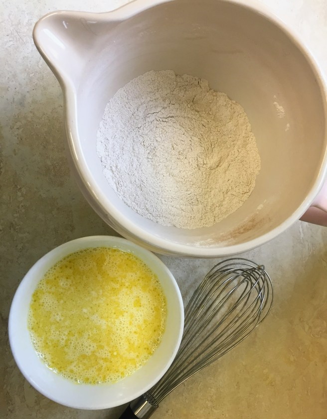 - Put a non-stick frying pan over a medium heat. Pour the wet ingredients into the dry ingredients and whisk until you have a smooth batter. It should be easily pourable, but thick enough to leave a trail in the mixture, which holds its shape for a few seconds when you drizzle some from a spoon. If it seems a little thick add an extra tablespoon of non-dairy milk.