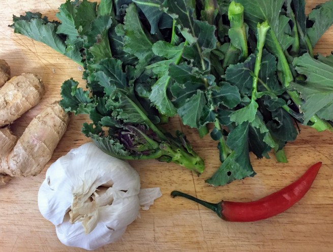 I’ve used purple sprouting broccoli, which is just coming into season in the UK (the harvest below came from our garden), but you could easily substitute or combine with other dark green leafy vegetables; kale, cavelo nero, tenderstem broccoli or regular broccoli. If I’m a bit low on fresh vegetables then I’ll usually have some frozen broad beans or edamame which would also make a good addition, and if you’re after something a little more substantial, then you can’t go wrong with some fried tofu, marinated in a little soya sauce.