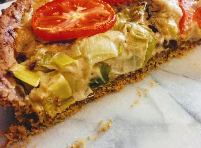 Up until recently I’d been struggling to nail down a really good recipe – I’ve tried fillings with tofu and gram flour (aka chickpea flour or besan), designed to be more quiche-like, but none of them really hit the spot. Then in a flash of inspiration (and an over-abundance of leeks) I decided to try adapting a side dish I make for particularly extravagant Sunday dinners; a sort of leek crumble, with fried leeks baked in a creamy cashew sauce with a sunflower seeds topping. I added some more punchy, cheesy flavours to the sauce, and with a bit of pastry and some sliced tomatoes, a tart was born.