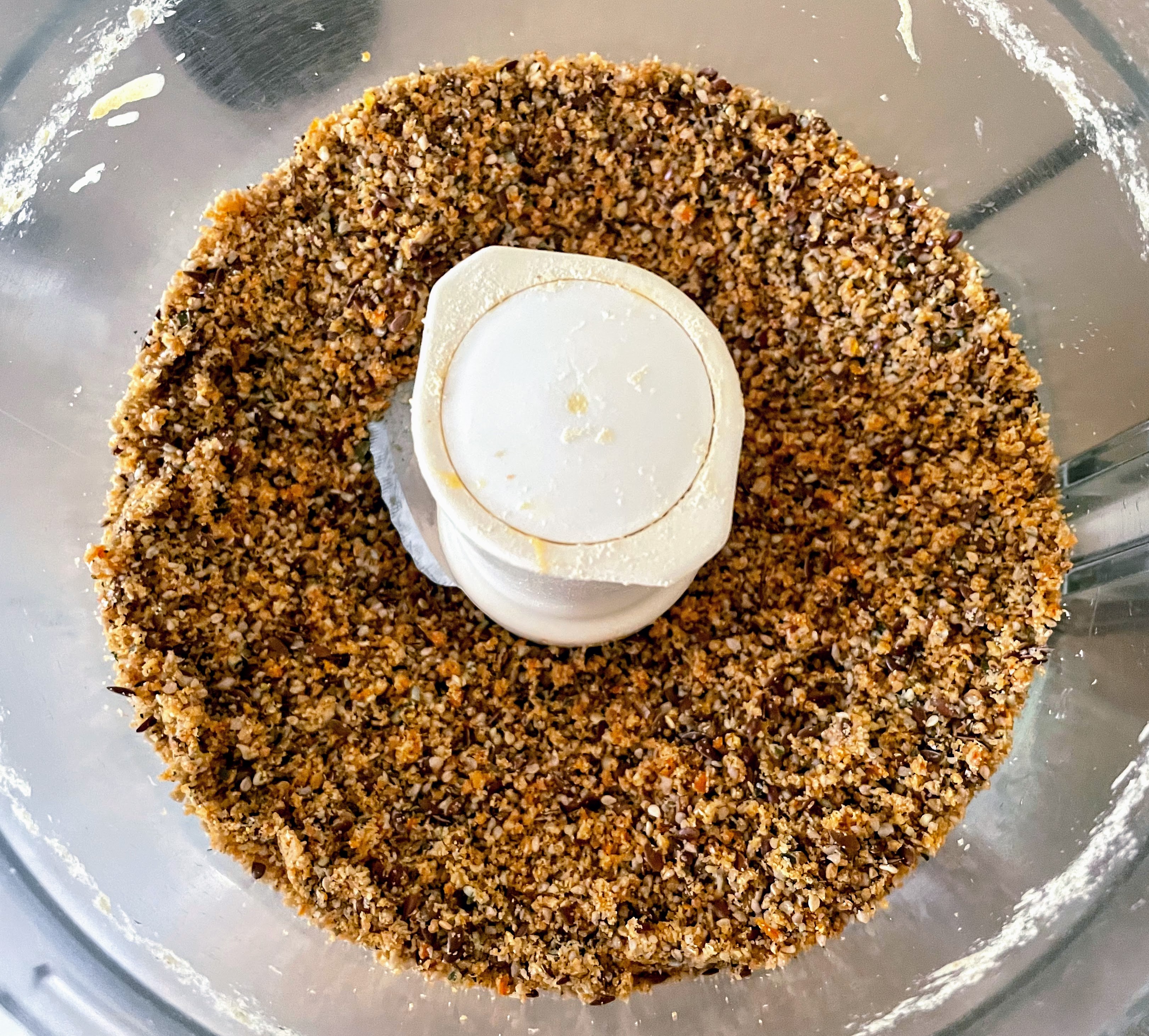 - Add 70g mixed seeds and 40g flax seeds to a food processor and blitz until roughly chopped. Add 45g gram flour, ½ tsp salt, 2 tbsp nutritional yeast, ½ tsp oregano, and a few grinds of black pepper and blitz again until the gram flour is evenly distributed (This is the one time when I don’t recommend tasting to check the seasoning – gram flour is very bitter when raw!).