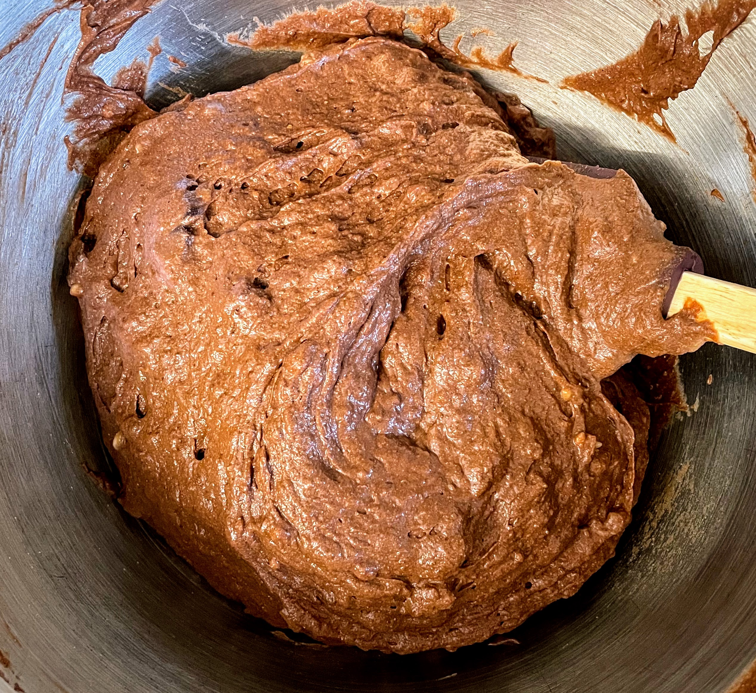 5. Chop 75g chocolate into small chunks. Pour the banana mixture into the flour mixture and whisk vigorously until there are no pockets of flour remaining, then stir in the chocolate chips with a spoon. Taste the mixture and add a little more maple syrup, a tablespoon at a time, if it doesn’t taste sweet enough.