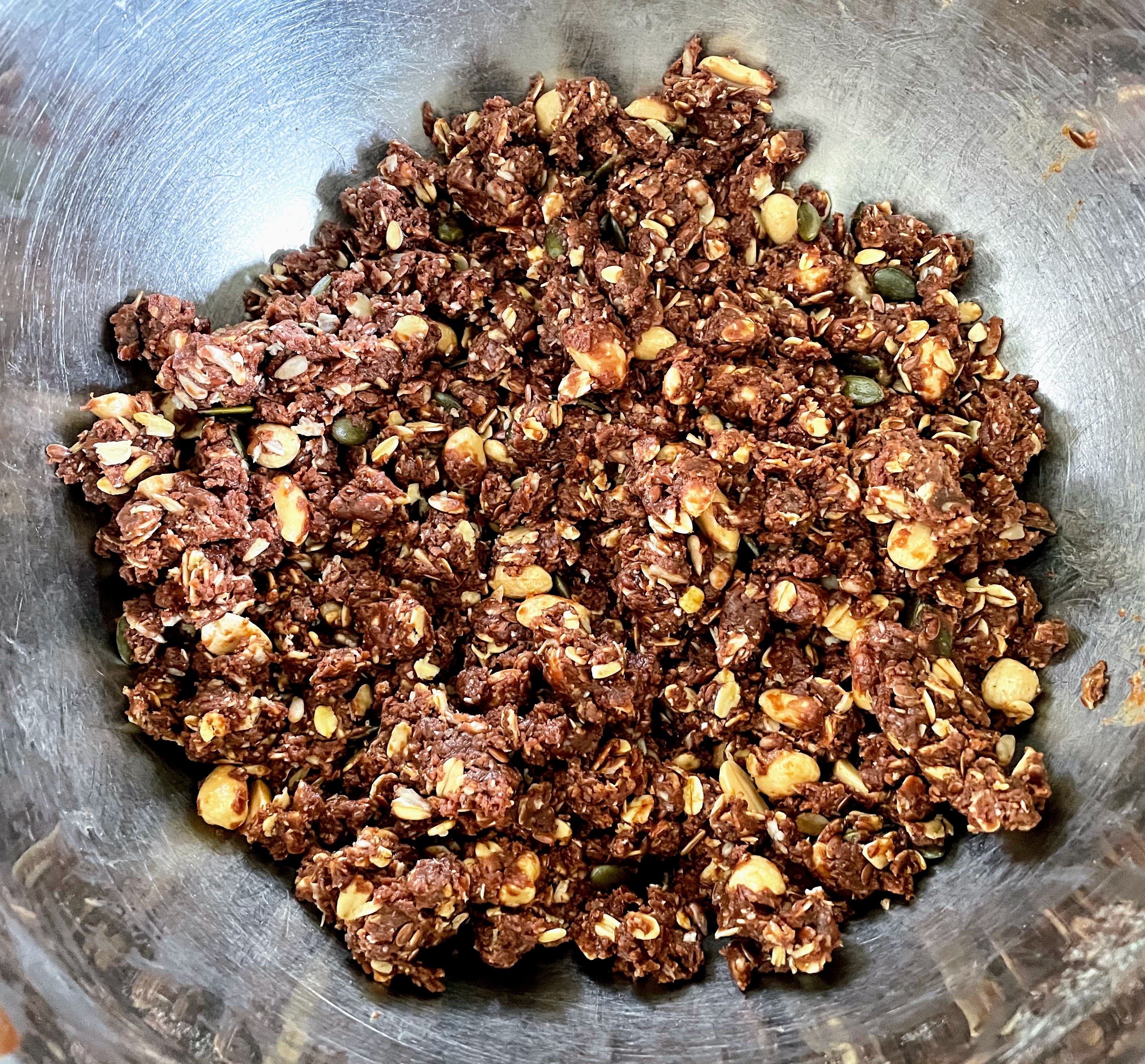 - Pour the chocolate mixture over the oats and nuts. You can use a spoon to stir everything together but I find it much easier just to use my hands. Once everything is thoroughly coated, tip the mixture into your prepared tin and press it down so it forms an even, compact layer. Pop in the freezer for half an hour, then remove from the tin and slice into 12-15 pieces.