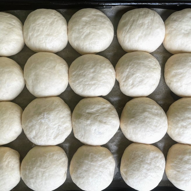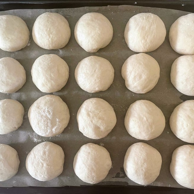Lightly flour a your worksurface, and line a large baking tray with baking paper. Press your fingers into the dough to ‘knock it back’ aka release the gas that has built up, and tip it out onto your work surface. The dough makes about 20 mini slider buns, so divide the dough into quarters, and cut each quarter into five equal sized pieces (I work on one quarter at a time, so put the other three back in the bowl under a tea towel to prevent them from drying out). If you want to be super precise, each piece of dough should weigh about 41g.