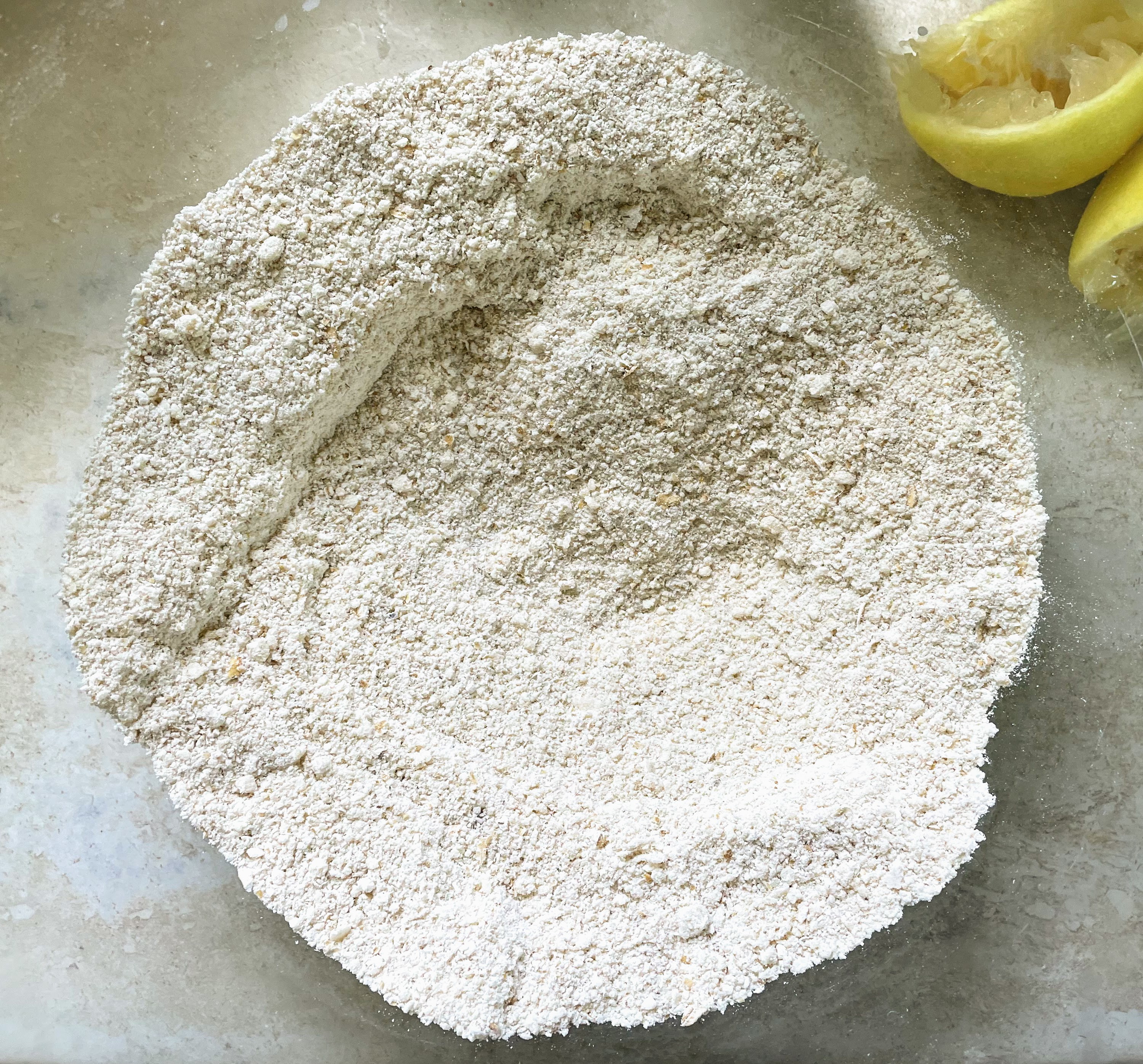 Zest and juice an unwaxed lemon, then set the zest aside. Measure out the non-dairy milk (I used oat milk but any will do) and stir in the lemon juice. The acid in the lemon juice will curdle the milk creating a kind of buttermilk substitute – set this aside while you measure out the dry ingredients.