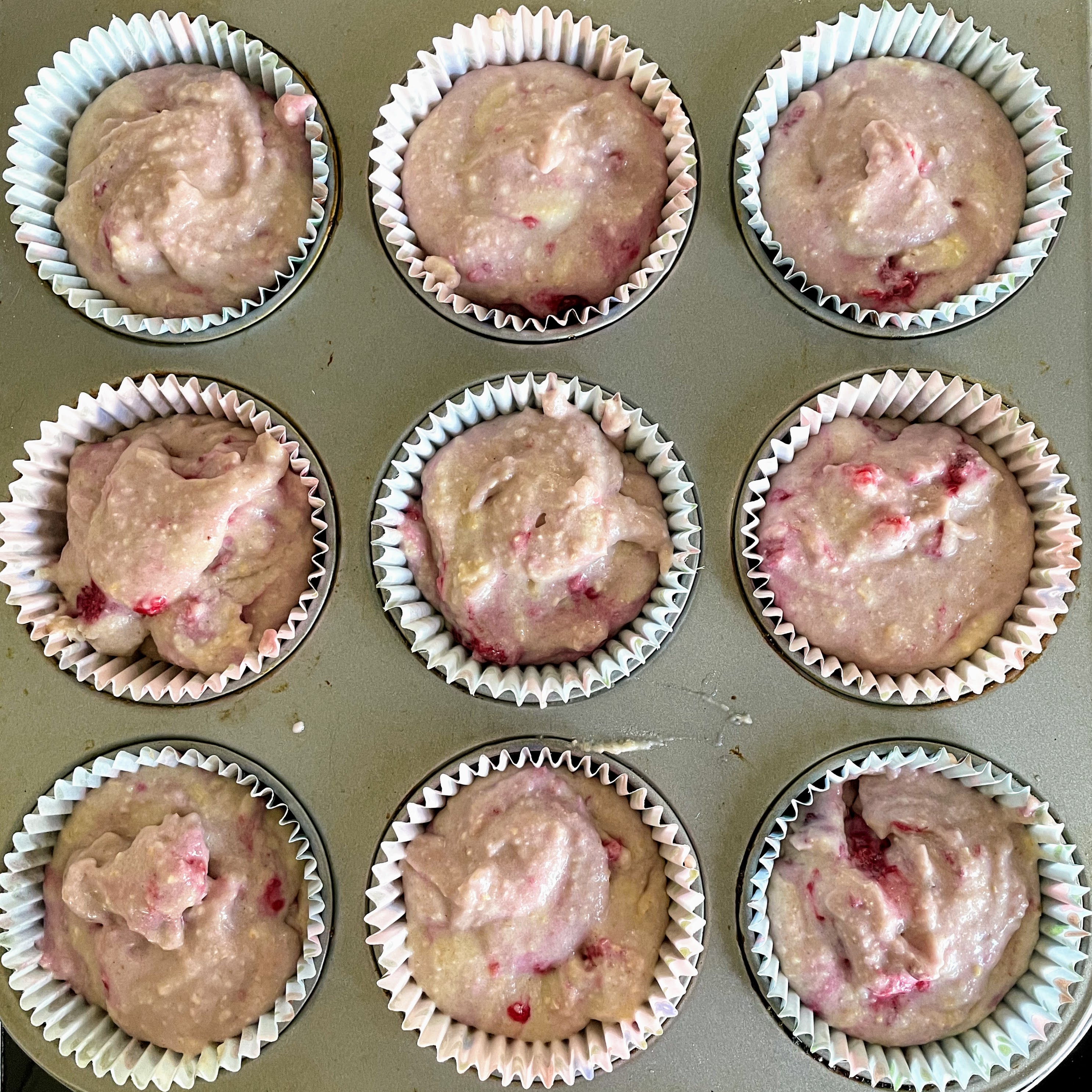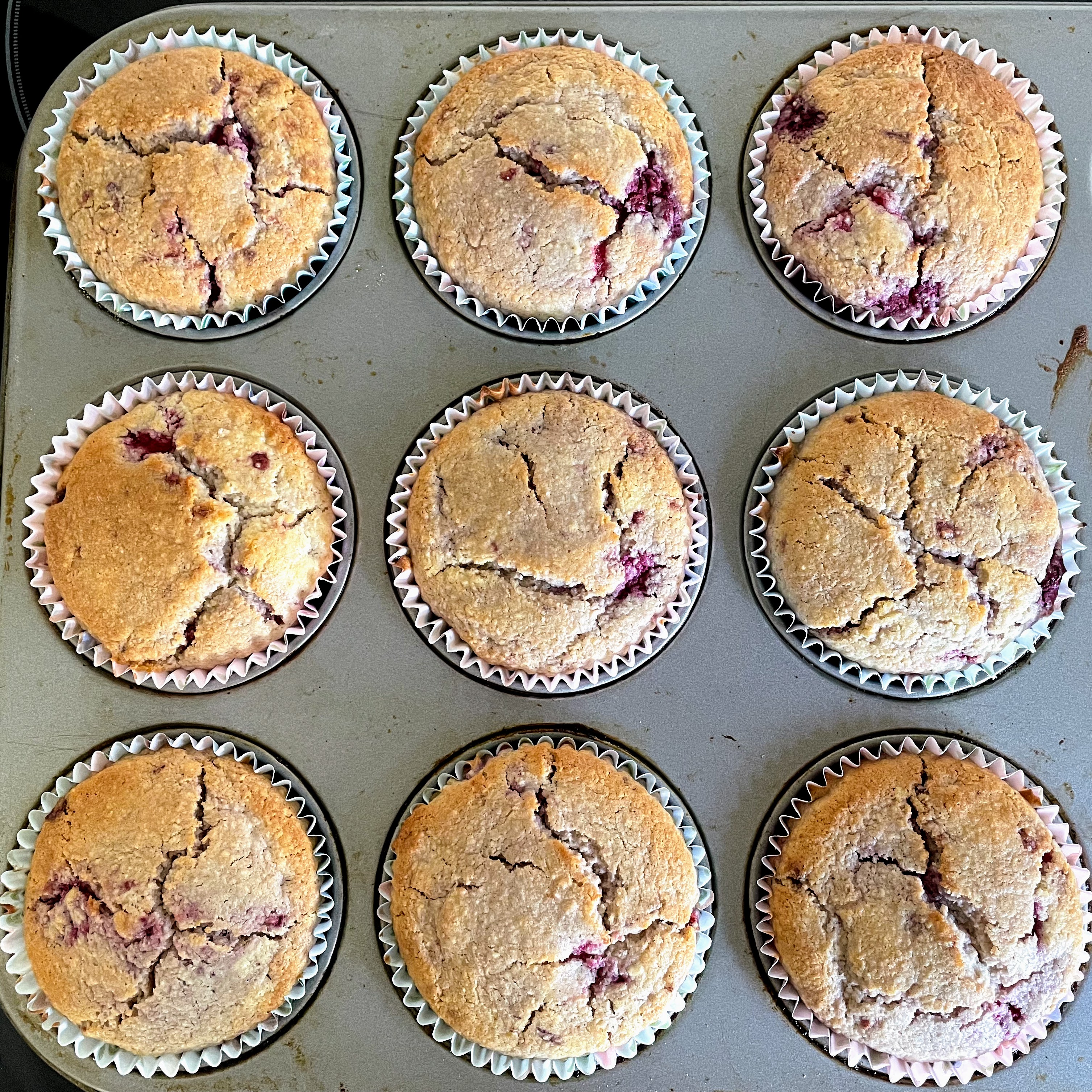 For large muffins, bake for 18–22 minutes, or 15–18 for smaller ones. If you use fresh raspberries then the cooking time is likely to be at the lower end of the range, or at the higher end if using frozen. Once cooked, they should be golden brown on top, and spring back when you gently press the centre. The skewer test is tricky for these, as you are very likely to hit a pocket of gooey hot raspberry.