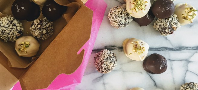 Vegan Truffles: Dark Chocolate and White Miso, White Chocolate, Raspberry and Pistachio, and Almond Caramel (Vegan, Gluten-free, Grain-free option, Nut-free option)