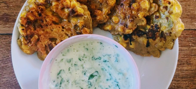Indian-spiced Sweetcorn Fritters with Raita (Vegan, Gluten-free, Grain-free)